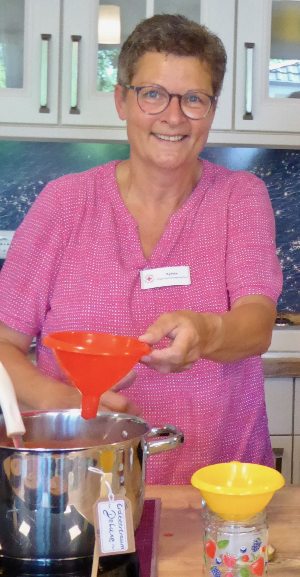Sie lassen sich immer wieder neue, schöne Sachen einfallen, um ihre Gäste auf andere Gedanken zu bringen: Die Mitarbeiter und Ehrenamtlichen des Warener DRK-Hospizes. Gestern drehte sich bei ihnen alles um die Erdbeere. Los ging es schon am Vormittag, als eine fleißige Kollegin mit einer Ehrenamtlerin und zwei Bewohnerinnen leckere Erdbeermarmelade gekocht hat. Am Nachmittag wurden dann die Gäste und Angehörigen von den Mitarbeitern – verkleidet als Erdbeeren – aus den Zimmern in wunderschön dekorierten Wohnbereich gelockt.