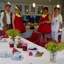 Sylvia hat die Gäste nicht nur herzlich begrüßt, sondern ihnen später auch einiges über die Erdbeere erzählt, die botanisch gesehen nicht zu den Früchten, sondern zu den Nüssen gehört.