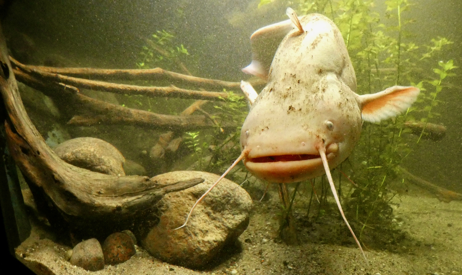 Der „Neue“ ist etwa 10 bis 15 Jahre alt, kommt aus der Spree, lebt aber schon seit etwa drei Jahren in „Quarantäne“ in Waren. Jetzt kann er auch von den Besuchern entdeckt werden. Doch die müssen manchmal ganz genauen hinschauen, denn Welse sind nachtaktiv und wenn er sich am Tag ausruht, muss man in dem 4000-Liter-Becken manchmal ein bisschen suchen. Aber bei den kühlen 19 Grad im Untergeschoß des Haus der 1000 Seen kann man sich ruhig etwas mehr Zeit für die Beobachtungen der 1000 Fische, Krebse, Muscheln, Schnecken und Schildkröten lassen.