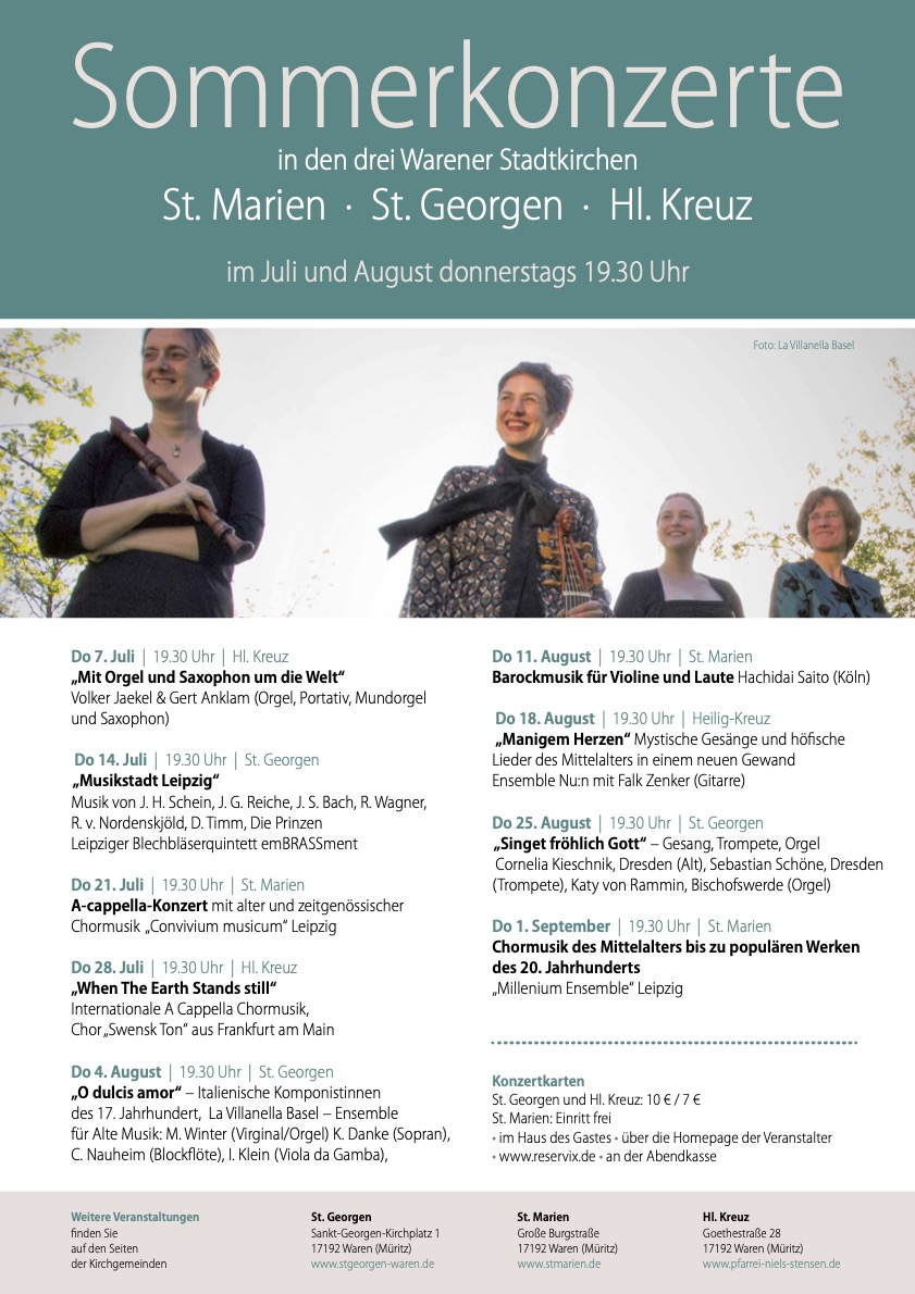Im Dreiklang der drei Warener Stadtkirchen gibt es im Juli und August jeden Donnerstag um 19.30 Uhr ein Sommerkonzert. Dazu läuten die Glocken reihum: Das Auftaktkonzert findet „Mit Orgel und Saxophon um die Welt“ (Volker Jaekel und Gerd Anklam) am 7. Juli in der Katholischen Kirche Waren statt. Weiter geht es in St. Georgen am 14. Juli mit dem Leipziger Blechbläserensemble „emBRASSment“ und ihrem Programm „Musikstadt Leipzig“. In St. Marien ist am 21. Juli „Convivium musicum“ Leipzig mit einem A-cappella-Konzert alter und zeitgenössischer Chormusik zu hören.