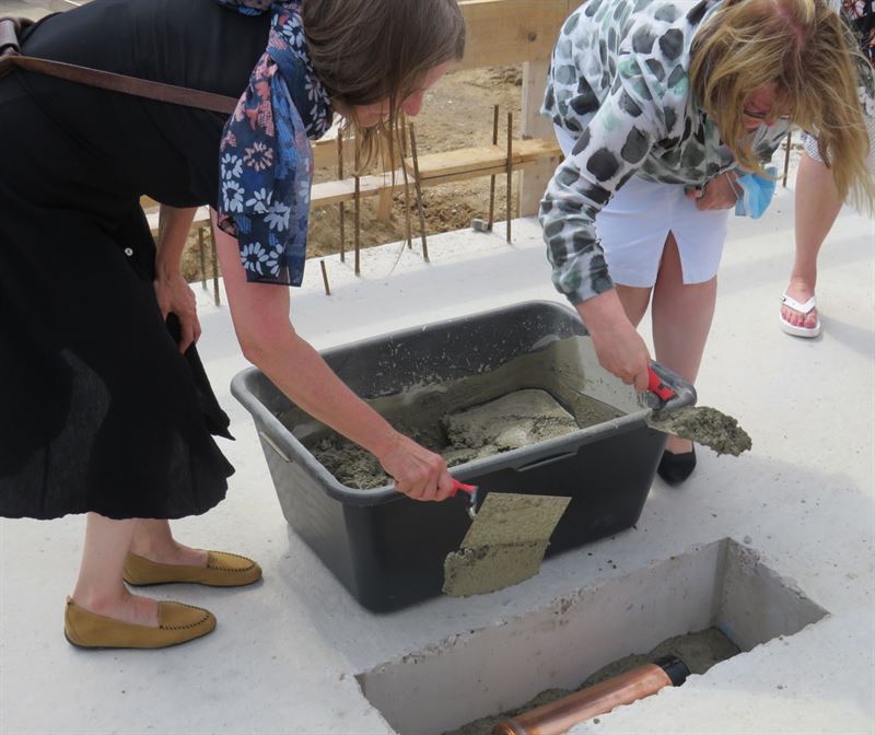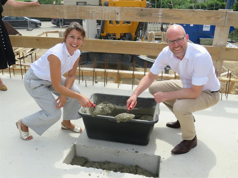 Bei der Grundsteinlegung befüllten Dr. Sylke Ilg, Chefärztin der Kinder- und Jugendpsychiatrie, und Carsten Krüger eine Zeitkapsel mit jeder Menge Erinnerungen. Neben einer Tageszeitung, der unvermeidlichen FFP2-Maske, einer Chronik der Kinder- und Jugendpsychiatrie und Dokumenten zur Neubau-Planung wurde die Zeitkapsel unter anderem auch mit einem Plakat mit Wünschen, aber auch Ängsten, von Patient der Kinder- und Jugendstation befüllt. „Dieser symbolische Akt soll nicht nur Glück bringen, sondern auch einer nachfolgenden Generation, die diese Kapsel vielleicht mal finden wird, von der turbulenten Zeit berichten, in der dieser Bau entstanden ist“, erläutert Ilg.