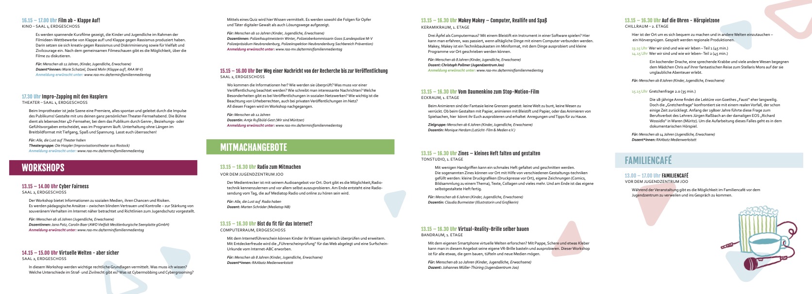 Der „Familien-Medientag Waren“ richtet sich an alle Menschen, die mehr über Medien erfahren möchten – sowohl an junge als auch an ältere Menschen. Damit soll auch der Austausch zwischen den Generationen angeregt werden. Der Medientag bietet den mitmachenden Familien Unterstützung bei Fragen rund um das Thema Medien und die Chance, gemeinsam über die Generationen hinweg Medien zu entdecken. Wer Medien versteht, kann aktiv und selbstbestimmt am gesellschaftlichen Leben in der Mediengesellschaft teilhaben.