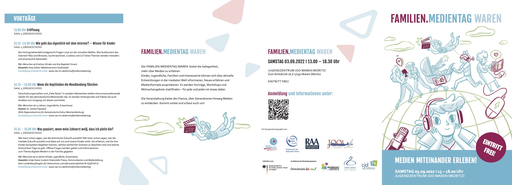 Der „Familien.Medien Tag“ ist eine Veranstaltung der RAAbatz Medienwerkstatt (RAA MV), des Förderverein der Regionalen Schule Waren/West e.V., des Jugendzentrum JOO und der Stadt Waren (Müritz). Gefördert wird er durch die Partnerschaft für Demokratie Waren (Müritz) im Rahmen des Bundesprogramms „Demokratie leben!“.