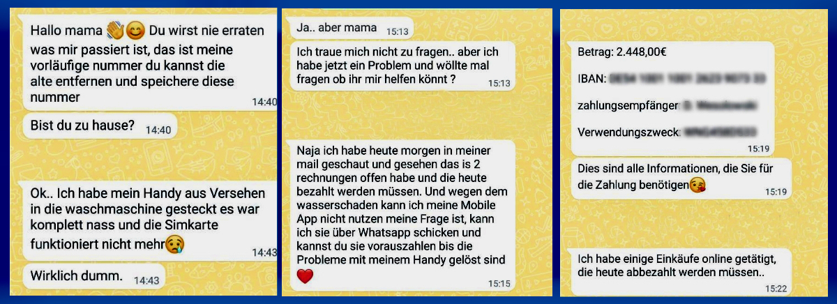 Anders als beim klassischen Enkeltrick, bei dem die möglichen Opfer einzeln angerufen werden und schlussendlich auch eine persönliche Geldübergabe vereinbart werden muss, ist der WhatsApp-Betrugsanruf elektronisch organisiert: Eine Vielzahl an ähnlichen Telefonnummern können per Knopfdruck erreicht werden. Die potentiellen Opfer erhalten eine WhatsApp-Nachricht von einer ihnen unbekannten Nummer: „Hallo Mama, mein Handy ist kaputt und das ist meine neue Nummer“, ist dort meist zu lesen. Um die Nachrichten authentisch wirken zu lassen, werden sie mit Emojis versehen.