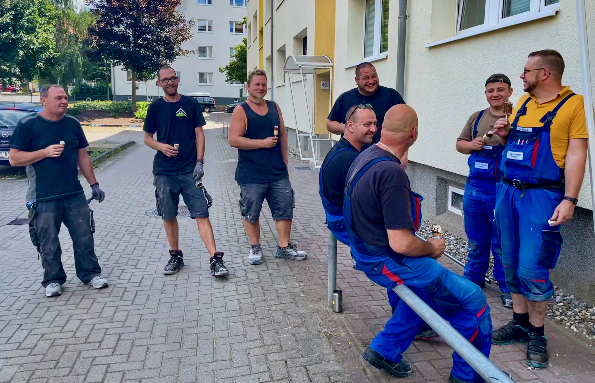 Das erleben sie auch nicht alle Tage: Eine Abkühlung für die fleißigen Handwerker gab es gestern auf den zwei „Großbaustellen“ der Wogewa Waren mbH. Geschäftsführerin Kristin Görlach machte sich auf den Weg in die Hans-Beimler-Straße 11-15 und Papenbergstraße 40/41 a-c, um sich mit einer kleinen Eis-Geste bei den Bauleuten zu bedanken. In der Beimlerstraße 11-15 erfolgt in 74 Wohnungen die Sanierung der Sanitärstränge. Es werden die vorhandenen Sanitärschächte demontiert und neue, bereits vorgefertigte Sanitärschächte neu installiert.