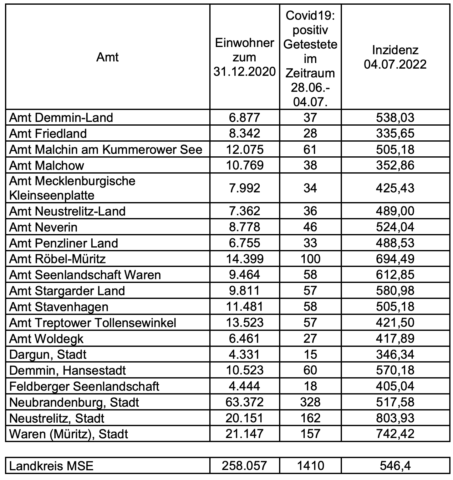 Und hier die aktuellen Corona-Inzidenzen des Landkreises Mecklenburgische Seenplatte – aufgeschlüsselt nach Städten und Ämtern – im Überblick: