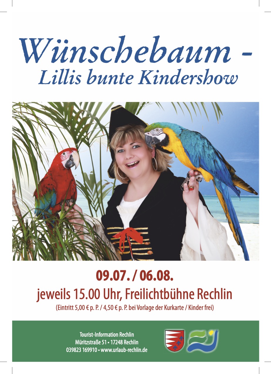 Auf der Freilichtbühne in Rechlin wird es bunt. Mit dem Kinderprogramm „Wünschebaum – Lillis bunte Kindershow“ startet am kommenden Sonnabend, 9. Juli, die Saison auf der Freilichtbühne. Von 15 bis 18 Uhr gibt es für Klein und Groß eine Mit-Mach-Show zusammen mit Hexe Lilli.