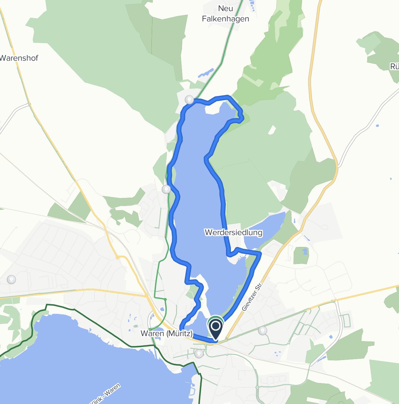 Auf vielen anderen Radwegekarten, unter anderem auf der bei Radlern sehr beliebten Internetseite „bikemap“, ist der Weg um den Tiefwarensee allerdings so ausgezeichnet, wie ihn die Warener seit Jahrzehnten kennen – direkt am Ufer (Foto unten). Versehen mit dem Hinweis: Diese Tour hat eine Gesamtlänge von ca. 9 km, wobei davon ca. 4-5 km reiner Naturweg ist. Das bedeutet, die eine oder andere kleine Baumwurzel sollte den begeisterten Radfahrer bzw. dessen Fahrrad nichts ausmachen.