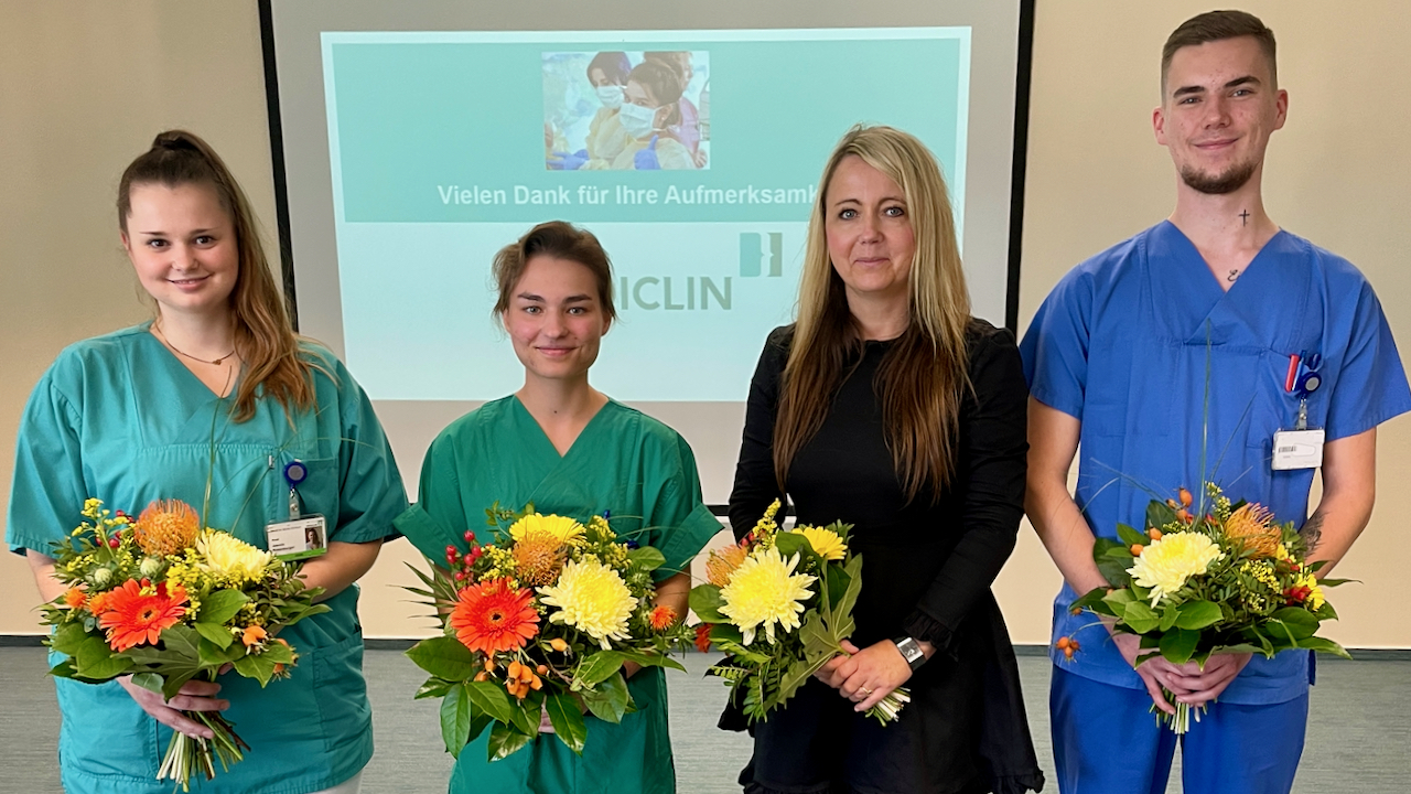 Foto oben: Die Auszubildenden Sophie Weber, Jasmin Rosenberger und Paul Schmallandt mit Praxisanleiterin Jeannette Romer