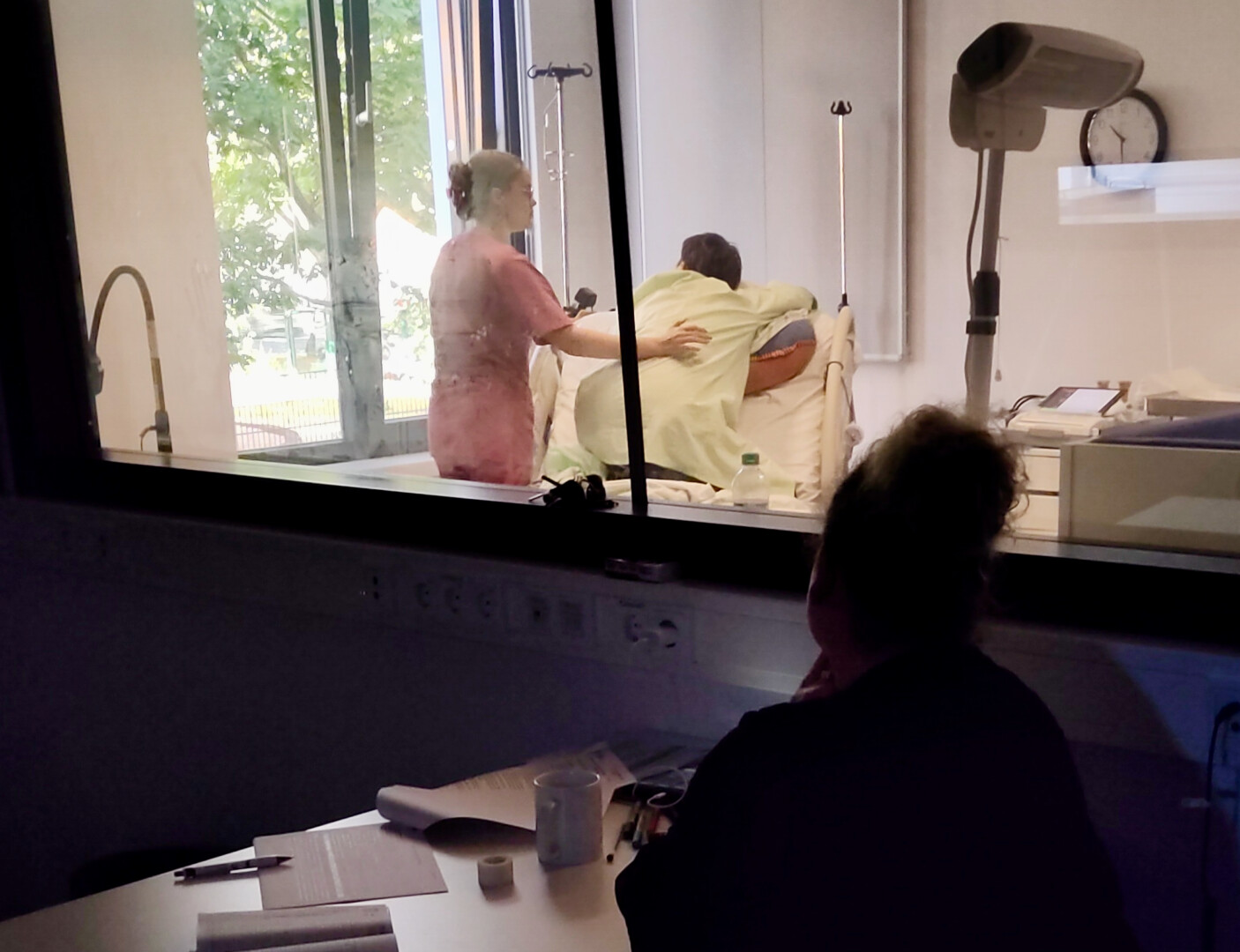 Bild: Eine Prüferin beobachtet im abgedunkelten Raum eine Studentin während der Geburtssimulation.