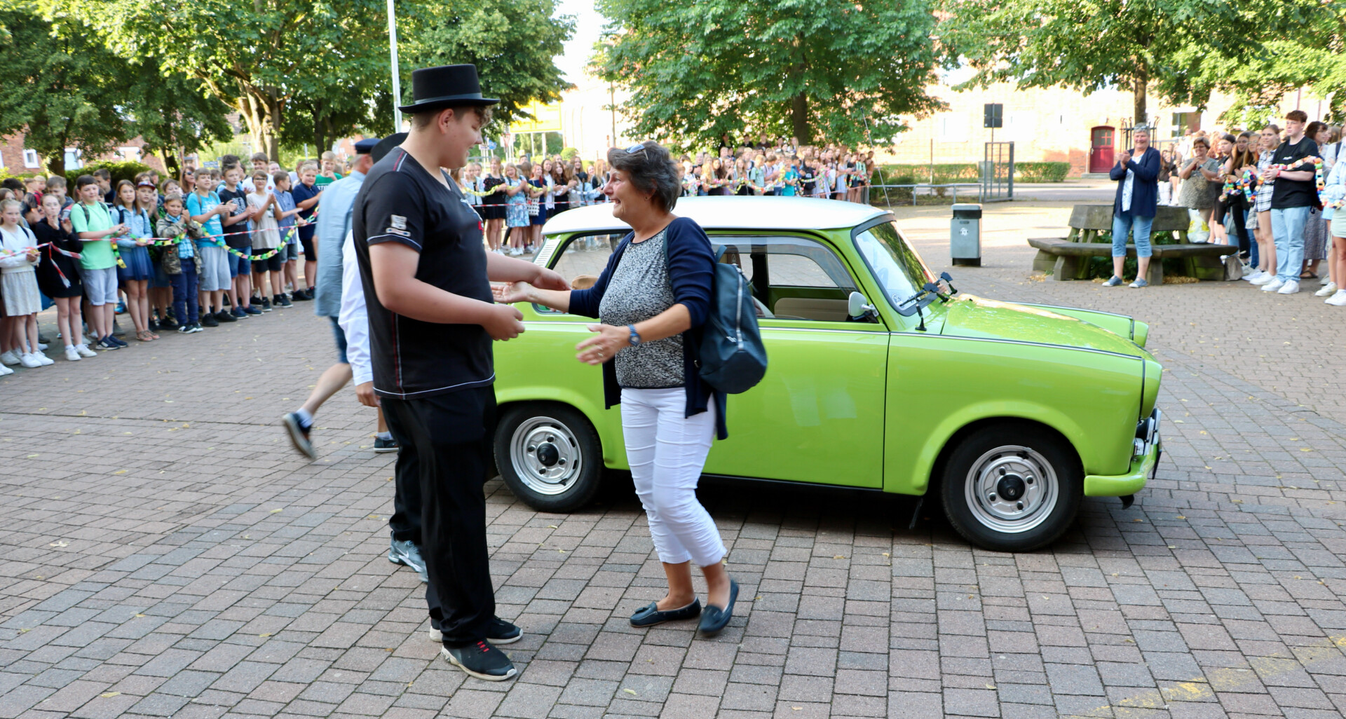 Ob sie sich im Spätsommer des Jahres 1982 mit einem Trabant zu ihrem ersten Arbeitstag in der Gustav-Sobottka-Schule in der Warener Goethestraße aufmachte, lässt sich nicht mehr so genau sagen. An ihrem gestrigen letzten Schultag fuhr Sylvia Hänsel am Morgen aber mit einem grünen „Trabi“ vor oder besser gesagt, sie wurde vorgefahren. Nach 42 Jahren als Lehrerin in Waren hieß es für die Schulleiterin der Regionalen Schule Waren/West gestern, Abschied zu nehmen. Dass ihr das alles andere als leicht fiel, ist ihren Schülern und Kollegen, die sie mit einem Spalier und dickem Applaus empfingen, sicherlich nicht entgangen – ihre „Chefin“ hatte mit sich und den Emotionen zu kämpfen. Zum Glück waren mit Ehemann Wolfgang und Sohn Marcus (Foto rechts) die beiden Menschen an ihrer Seite, die sie immer unterstützt, aufgefangen und wenn es sein musste, auch mal wieder aufgebaut haben. Denn in 42 Jahren ist einiges passiert im Lehrer-Leben von Sylvia Hänsel, vor allem die letzten 15 Jahre waren sehr schwer, wie sie in einem Gespräch mit „Wir sind Müritzer“ verrät. Das hat einen Grund: Die Bildungspolitik in Deutschland und Mecklenburg-Vorpommern, aber auch in der Stadt Waren.