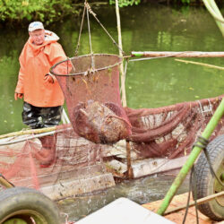 Das Highlight war natürlich das Abfischen. Zweimal holten die Müritzerfischer auf traditionelle Art und Weise die „Brocken“ aus dem Teich. Neben Karpfen auch Störe, Hechte und Welse. Etliche Fische wurden gleich vor Ort ausgenommen und verkauft. Frischer geht’s nicht.