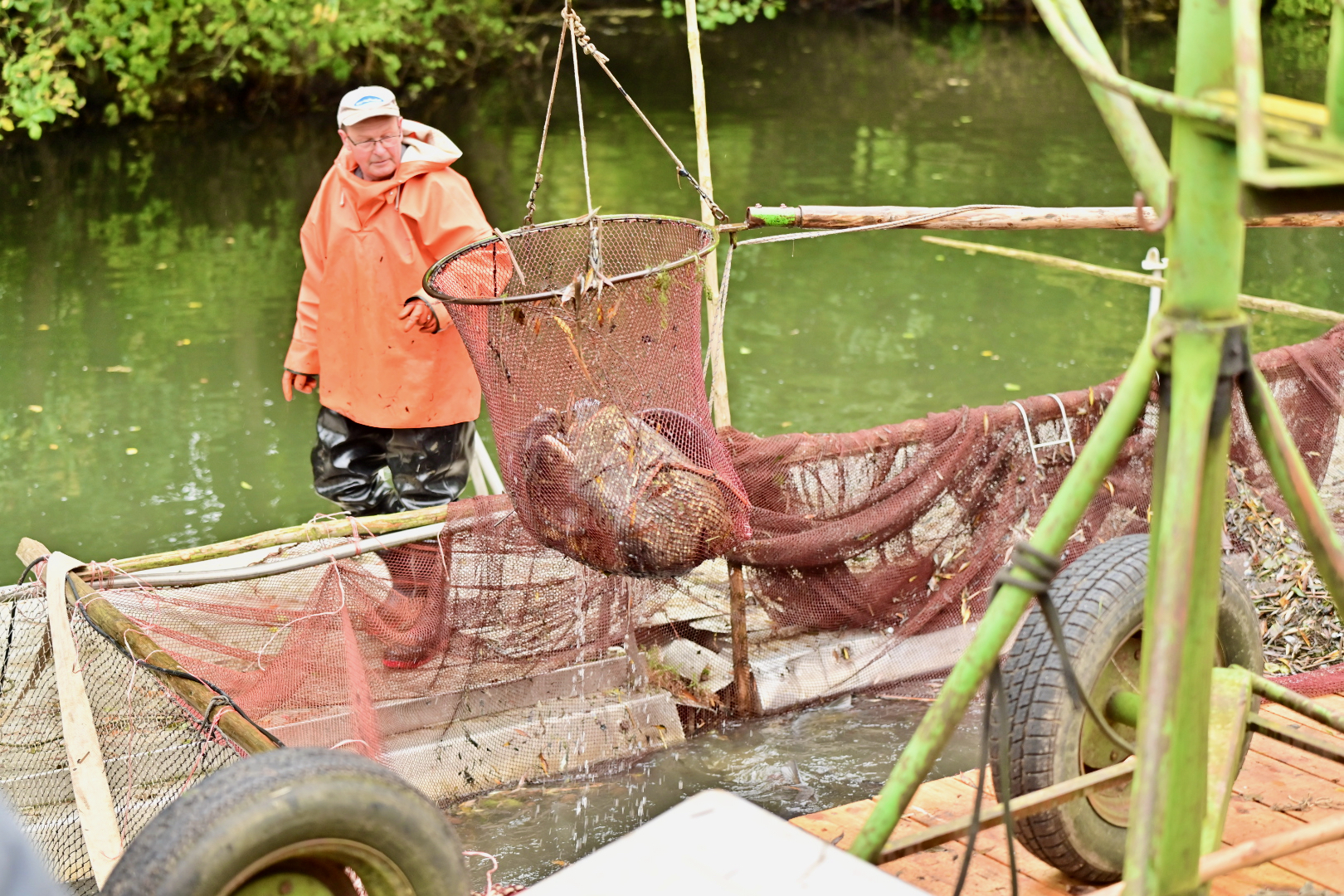 Das Highlight war natürlich das Abfischen. Zweimal holten die Müritzerfischer auf traditionelle Art und Weise die „Brocken“ aus dem Teich. Neben Karpfen auch Störe, Hechte und Welse. Etliche Fische wurden gleich vor Ort ausgenommen und verkauft. Frischer geht’s nicht.