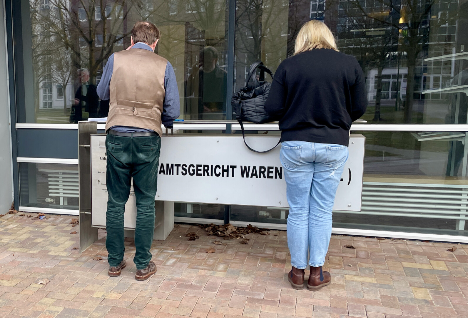 Schon eine gute Stunde vor Prozessbeginn warteten gestern Mittag etliche Journalisten vor dem Amtsgericht, um bloß nicht die Ankunft von Christian Drosten zu verpassen. Denn im Gerichtsgebäude selbst hatte man das Fotografieren dieses Mal komplett verboten. Unüblich, denn bei öffentlichen Prozessen ist das Filmen und Fotografieren normalerweise zu Beginn der Verhandlung gestattet. Aber, am Warener Amtsgericht scheint man – wie ein Reporter aus der Hauptstadt ziemlich angefressen meinte – Journalisten so gar nicht zu mögen. So durften sie ihre Meldungen in einer der Pausen auch nicht im Gebäude in ihre Laptops tippen, sondern mussten nach draußen vor die Tür und den Amtsgerichts-Briefkasten im frischen Müritz-Wind als Schreibtisch nutzen. (Foto rechts).