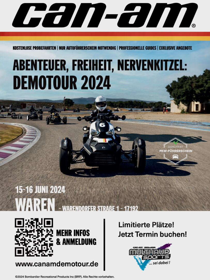 Das Can-Am 3-Rad Lineup tourt derzeit durch 17 Städte in Deutschland und Österreich und macht am 15. sowie 16. Juni auch in Waren Station – im Autohaus Multhaup in der Warendorfer Straße. Das Autohaus vertreibt die beliebten Modelle bereits seit einigen Jahren und hat schon mehrfach Probe-Events angeboten.