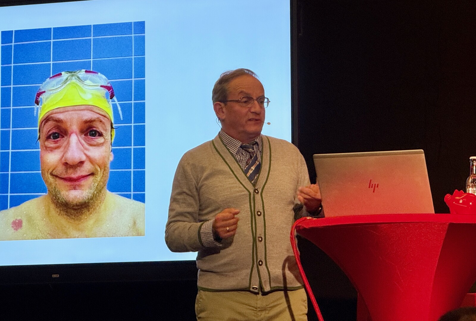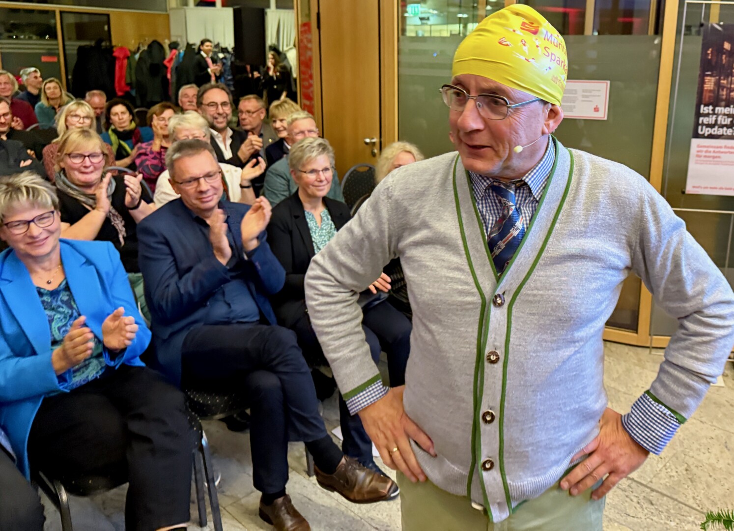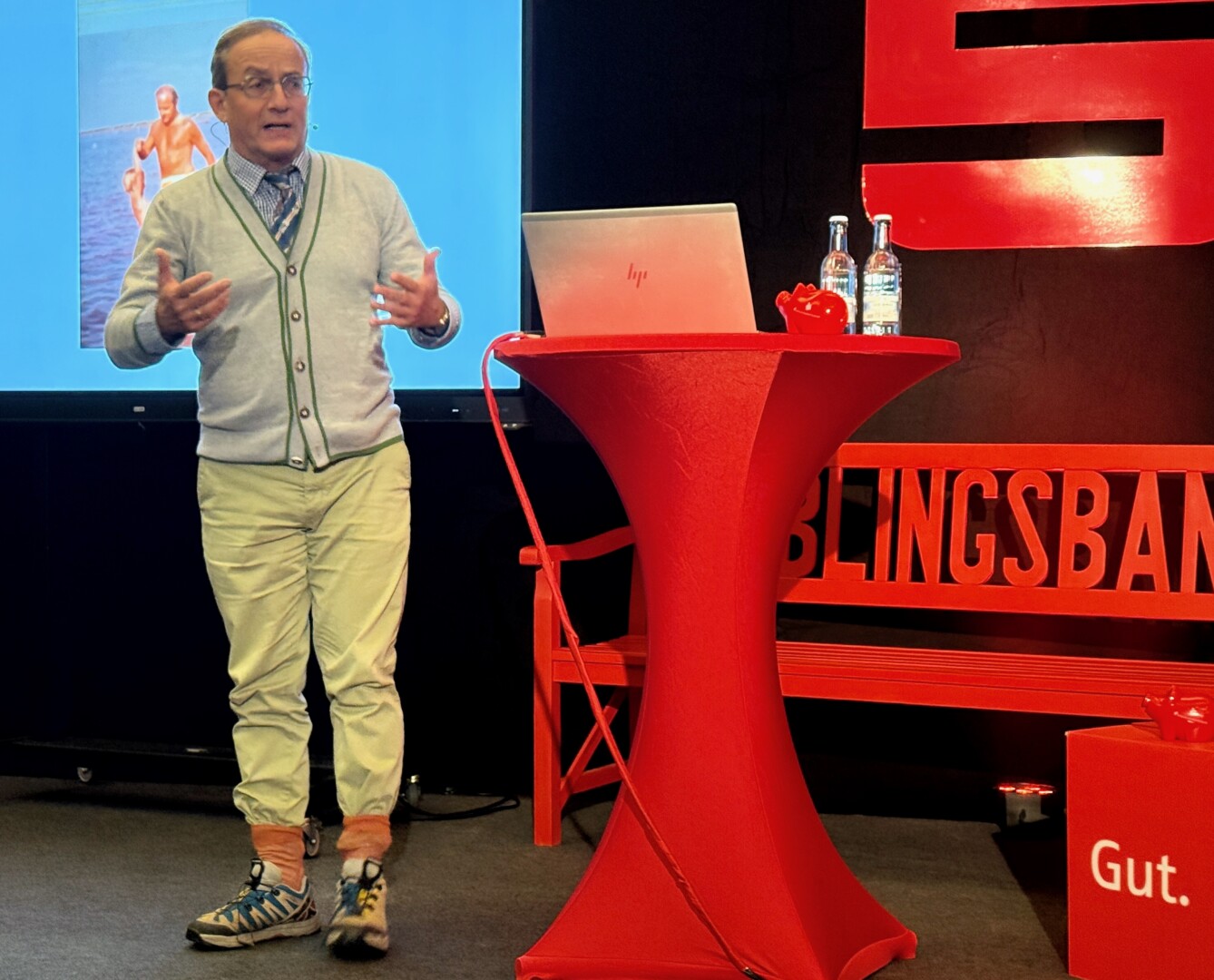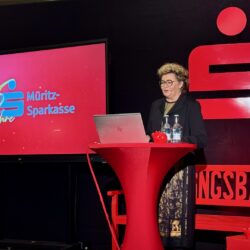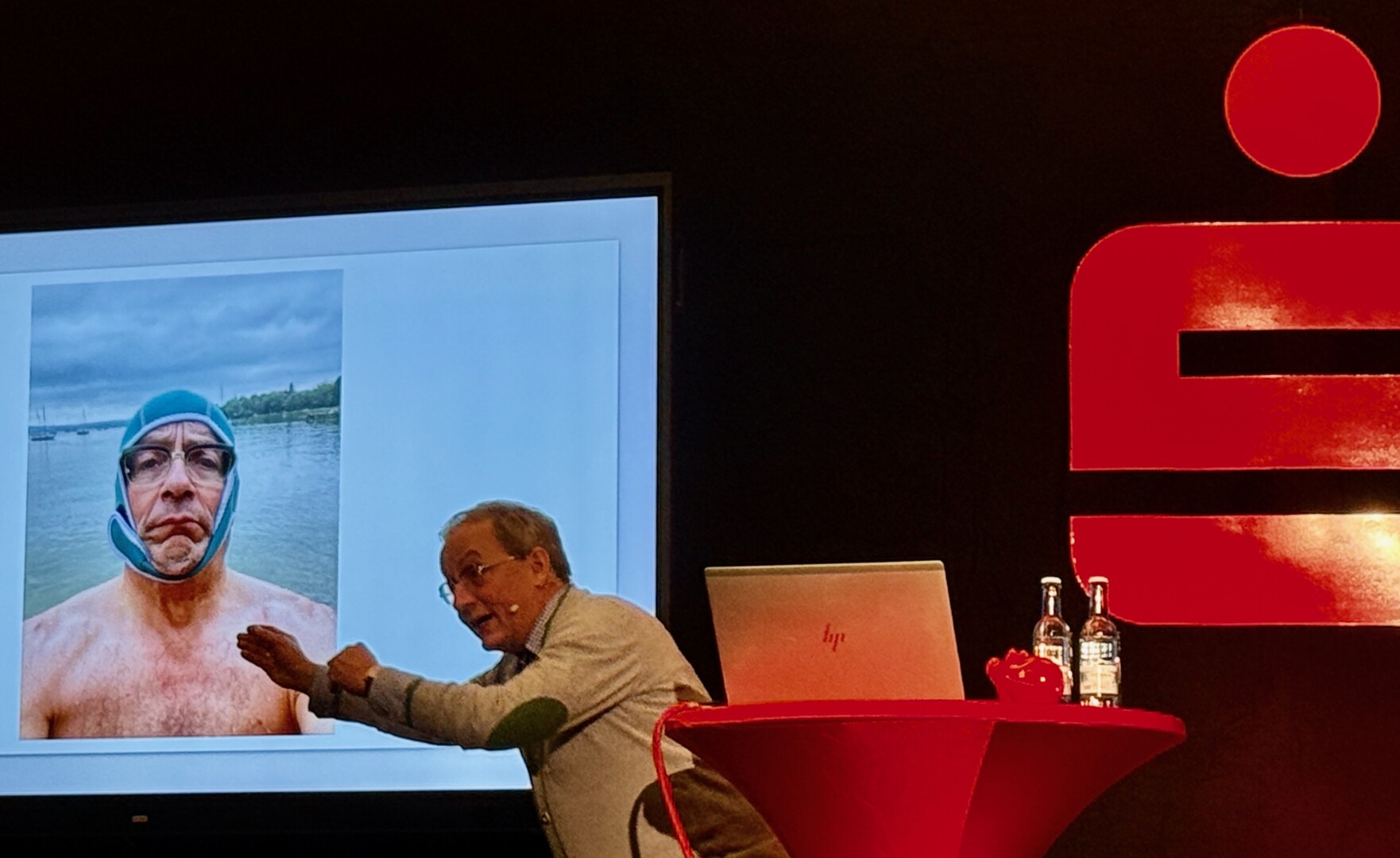 Auf unterhaltsame Art und Weise berichtete der Moderator, der einst durch die Comedy-Sendung „Samstag Nacht“ auf RTL bekannt wurde und auch als Musiker und eben als Freund der Extreme von sich Reden machte, in der Sparkassen-Hauptfiliale von seinem Schwimm-Experiment, wie es dazu kam und welche Hürden er bisher nehmen musste, um das durchzuhalten. 1000 Tage hintereinander sollen es übrigens insgesamt werden, sein Ziel würde er im März des kommenden Jahres erreichen. Das Bad am Donnerstagfrüh war übrigens nicht sein erstes in der Müritz, gemeinsam mit NDR-Moderatorin Bettina Tietjen campte er bereits an der Südmüritz und hat sich dabei natürlich auch in die Fluten gestürzt.
