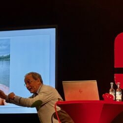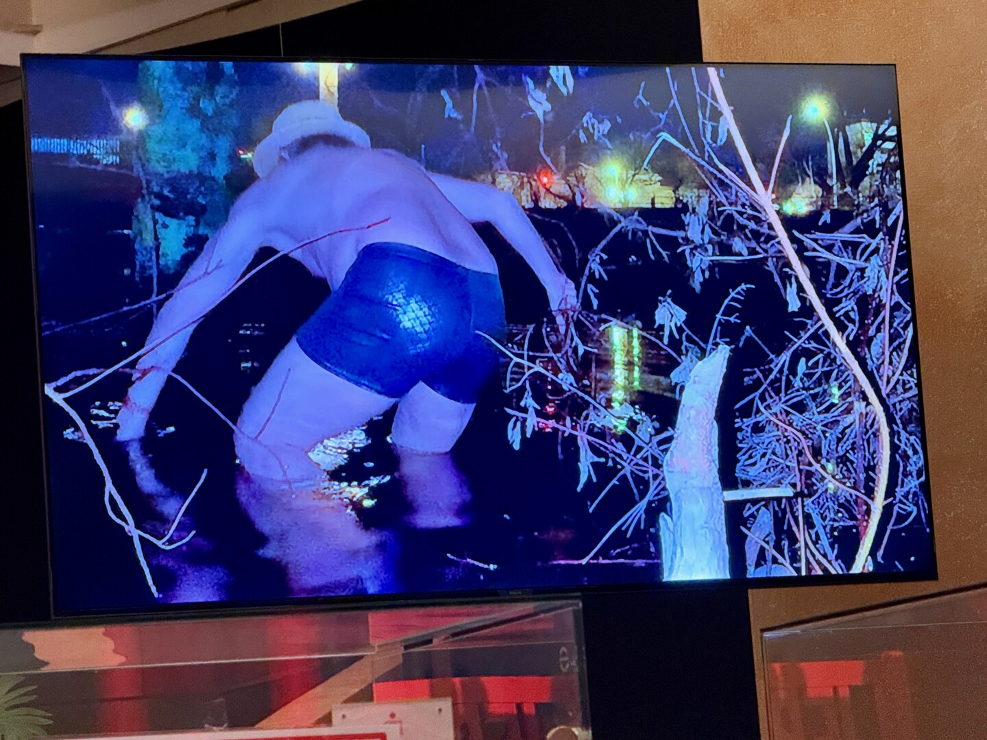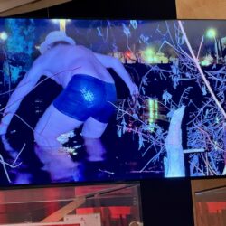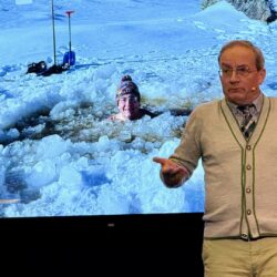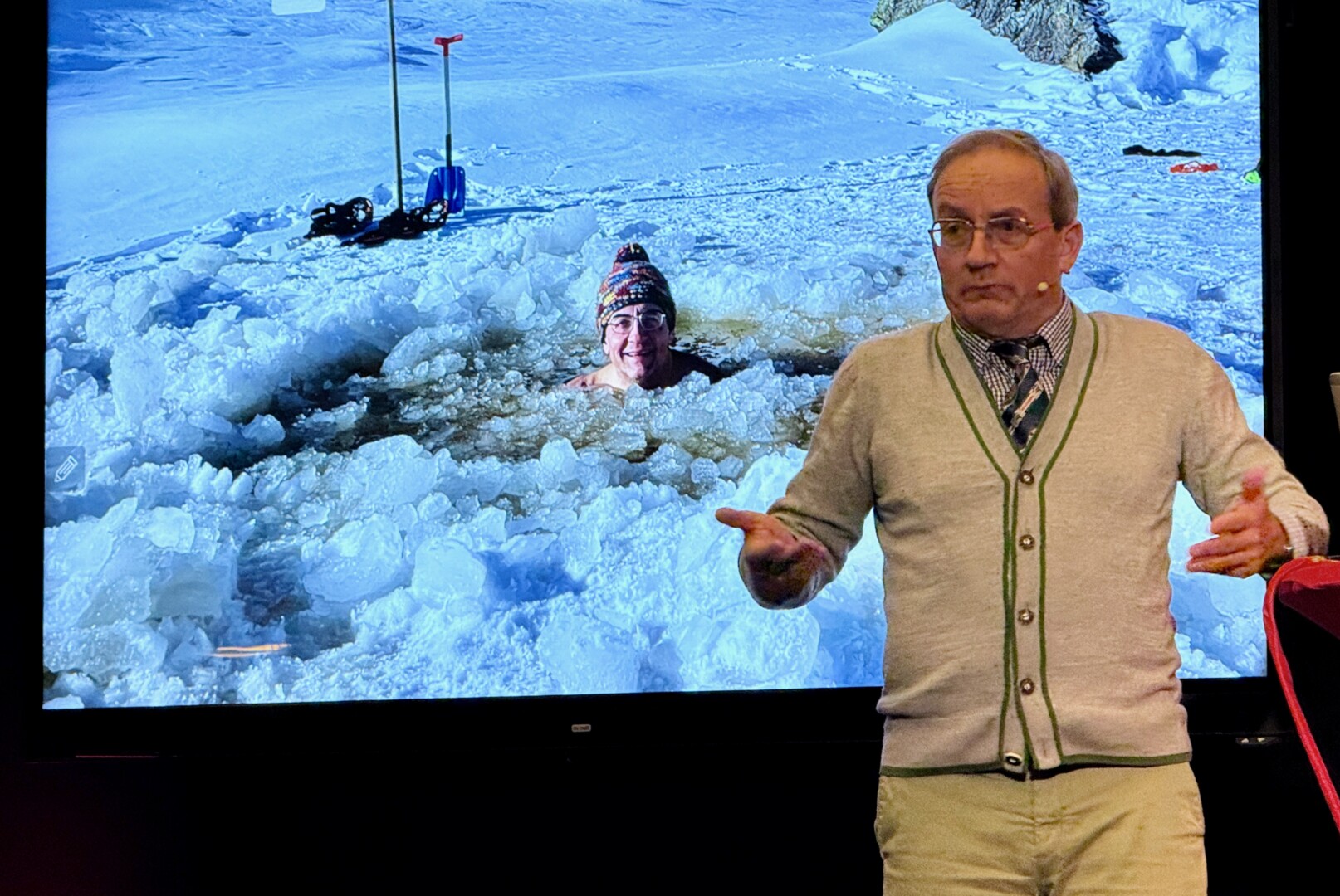 Mitunter musste Boning, der in Wanderschuhen sowie einer in die Strümpfe gestopften Hose auf der Sparkassen-Bühne stand, ganz schön improvisieren. Wie beispielsweise am Flughafen Hannover, als er in ein Regenrückhaltebecken stieg, oder bei der Geburt seines Sohnes Oskar, als eine japanische Sitzbadewanne herhalten musste. Auch in Schnee hat er sich schon eingebuddelt, oder er stürzte sich kurzerhand ins Ikea-Bällebad. Manchmal wagte er sich in Gewässer, die eigentlich gar nicht zum Baden geeignet sind, oder musste sich durch Gestrüpp und Steine kämpfen – geschadet hat’s ihm aber ganz offenkundig nicht. Hier und da gab’s auch besondere Begegnungen. Mit Schwänen beispielsweise. Die konnten wahrscheinlich auch nicht glauben, was sie dort erleben mussten.