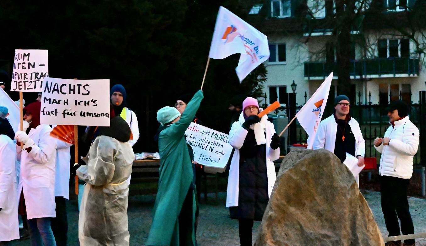 Plakate statt Skalpelle: Knapp 40 Ärzte des MediClin Müritz-Klinikums haben heute früh bei einem Warnstreik ihren Unmut über ihre Arbeitsbedingungen zum Ausdruck gebracht. Um nicht nur die Arbeit im Krankenhaus niederzulegen, sondern auch der Öffentlichkeit mitzuteilen, wie ihre augenblickliche Situation ist, zogen sie mit weißen Kitteln, Trillerpfeifen und Plakaten zum Kreisel unterhalb der Herrenseebrücke und erfuhren durch hupende Autofahrer viel Zuspruch. Hintergrund des Warnstreiks, der bis Mitternacht andauert, ist der noch immer fehlende Tarifvertrag für die Mediziner, was letztendlich zu einem „Ausbluten beim Personal“ führe und damit die Existenz des Hauses massiv bedrohe. Und so war dann auf einem Plakat auch zu lesen: „Patient: MediClin Müritz-Klinikum, Todesart: unnatürlich, Todesursache: Verwaltungs-Organversagen.“