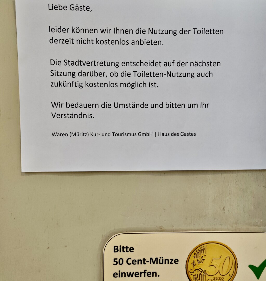 Wer in Warens Innenstadt unterwegs ist und mal dringend wo hin muss, hat nicht viele Möglichkeiten. Eine der wenigen öffentlichen Toiletten ist die im „Haus des Gastes“ auf dem Neuen Markt. Dort muss seit Anfang des Jahres wieder bezahlt werden, wie ein angeklebter Zettel verrät. Schuld daran sollen in gewisser Weise die Stadtvertreter sein. So heißt es auf dem Papier: „Liebe Gäste, leider können wir Ihnen die Nutzung der Toiletten derzeit nicht kostenlos anbieten. Die Stadtvertretung entscheidet auf der nächsten Sitzung darüber, ob die Toiletten-Nutzung auch zukünftig kostenlos möglich ist.“ Doch ganz so, wie es auf dem Zettel steht, ist es nach Informationen von „Wir sind Müritzer“ nicht.