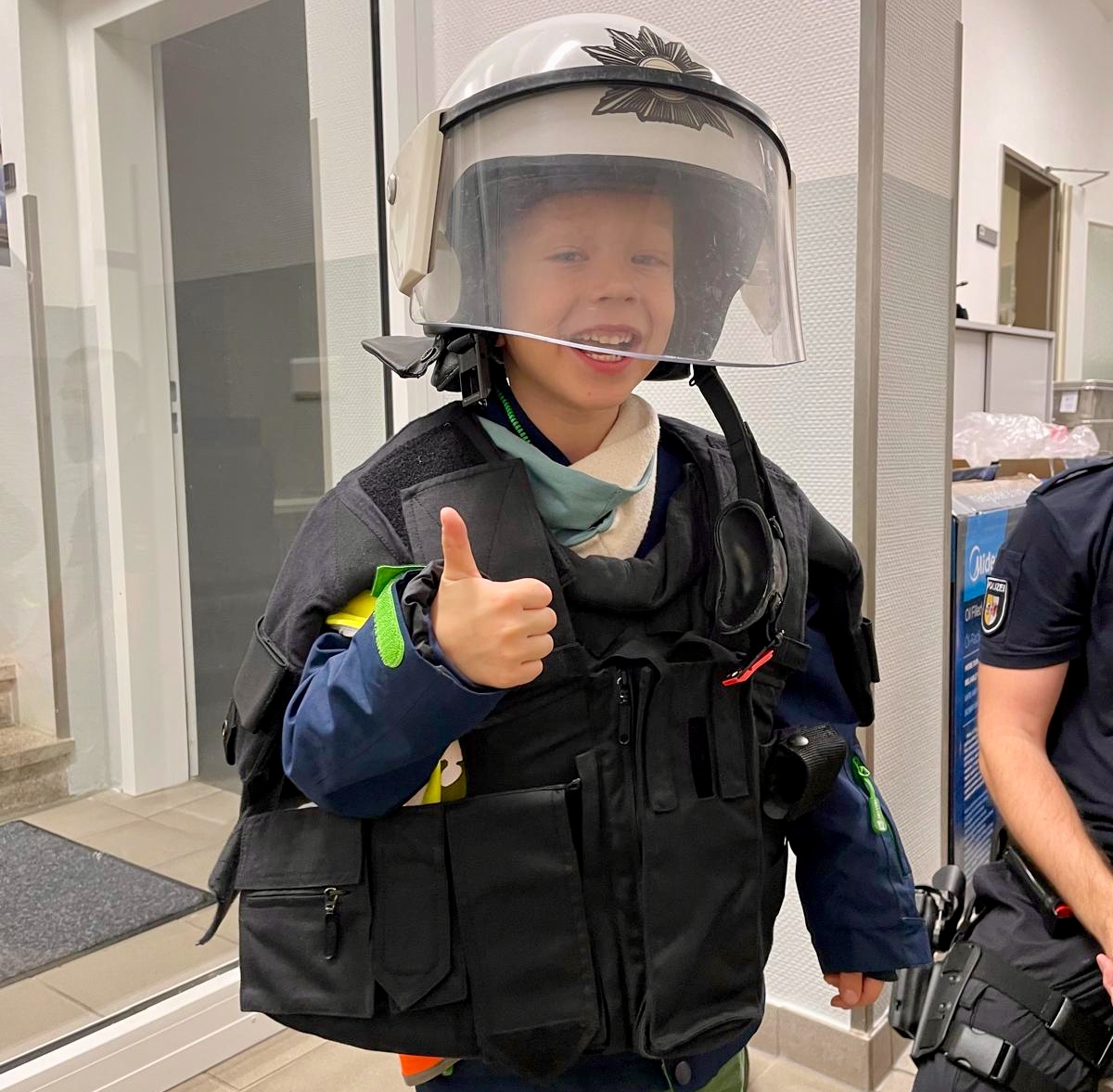 Zwei junge, aufgeschlossene Polizisten nahmen die Weinbergschnecken liebevoll in Empfang. Auf der Polizeiwache erlebten dann einiges. So bekamen sie die Möglichkeit, die gesamte Ausrüstung der Polizisten kennenzulernen. Die Schutzwesten und -helme durften die Kinder sogar anziehen bzw. aufsetzen. Und auch die Arrestzelle lernten sie kennen. Die unzähligen Fragen der „kleinen Weinbergschnecken“ wurden kindgerecht und ausdauernd beantwortet. Was besonders positiv auffiel, war, dass die Polizisten immer auf Augenhöhe mit den Kindern agierten.
