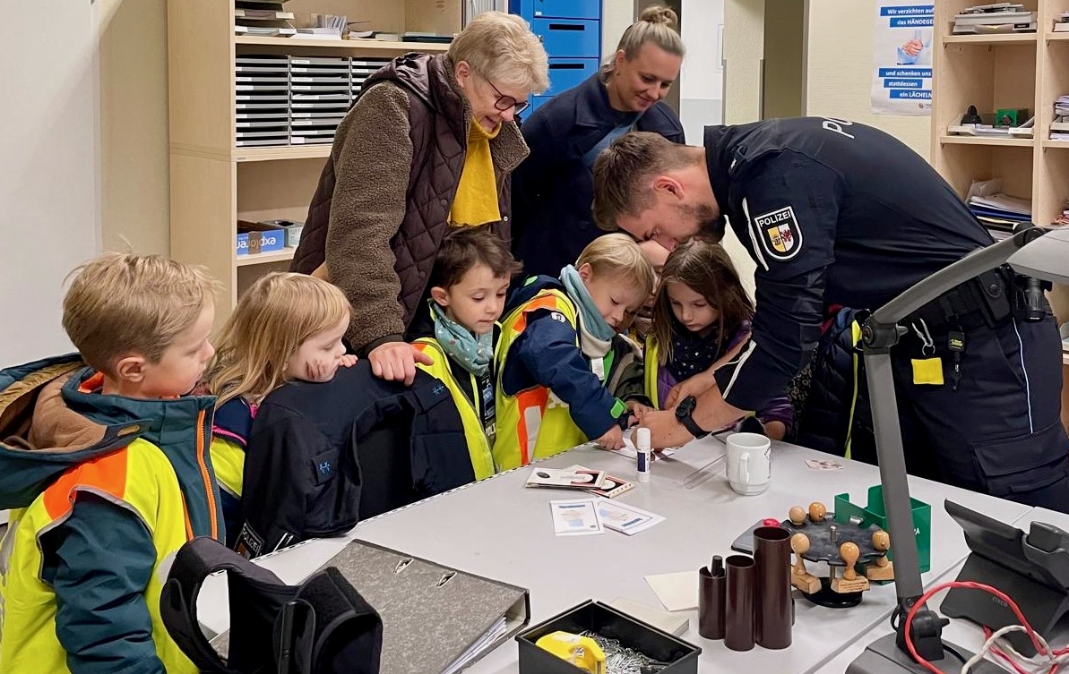Gegen 18.30 Uhr machten sich die Knirpse dann mit leuchtenden Warnwesten ausgestattet zu Fuß los auf den benachbarten Mühleberg. Die Kinder wurden in zwei Gruppen aufgeteilt mit jeweils zwei Erzieherinnen. Beide Gruppen wurden mit Walkie-Talkies ausgestattet. So waren die Kinder funktechnisch dauerhaft verbunden, da verschiedene Wege zum Ziel bewandert wurden. Als die Mädchen und Jungen das Polizeigebäude entdeckten, war die Freude riesig.