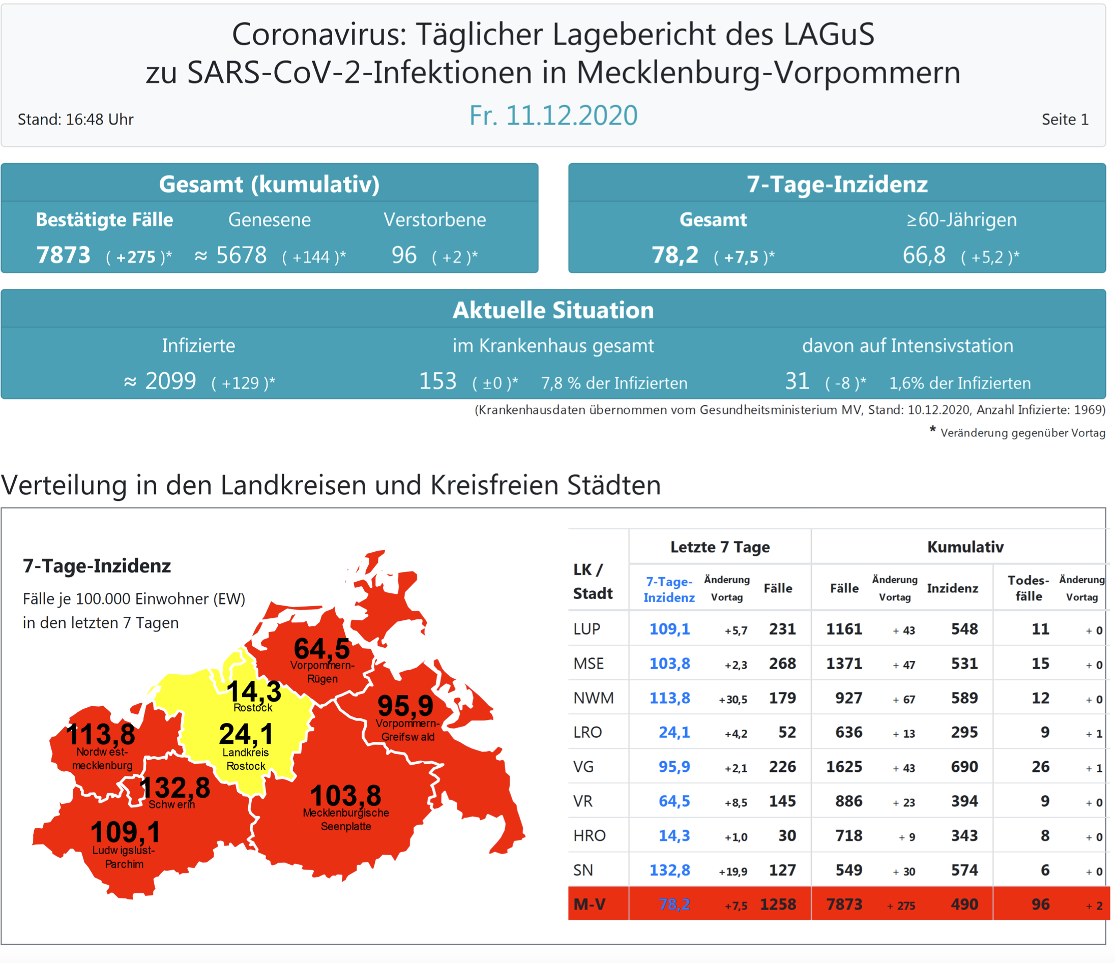 Insgesamt wurden in MV bisher 7873 Infektionen festgestellt. Im Land gab es bislang 96 Todesfälle, zwei mehr als gestern