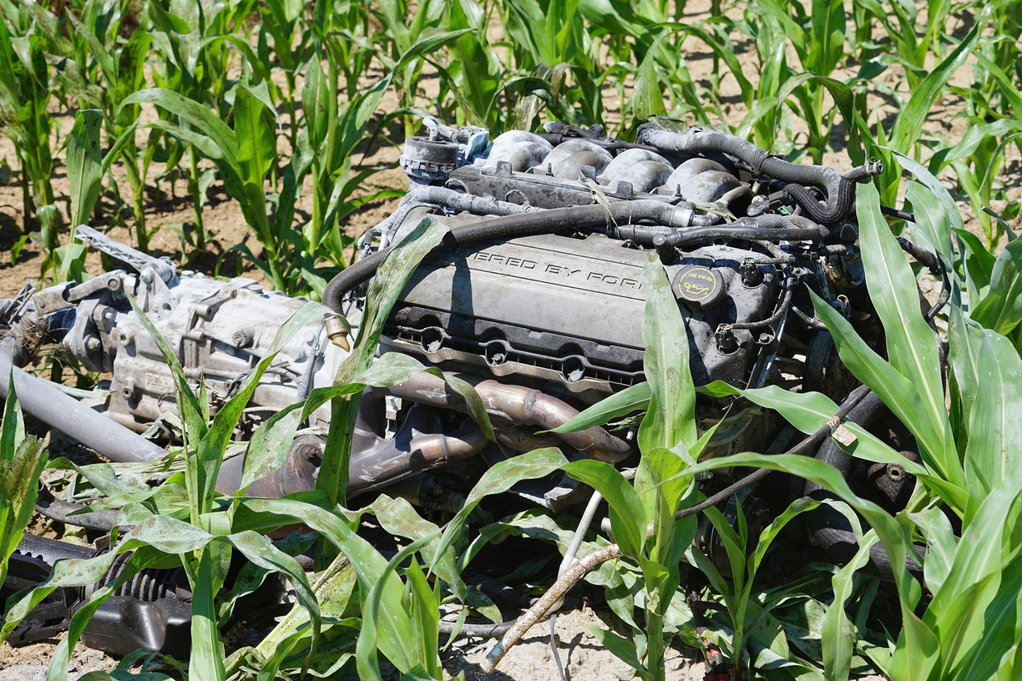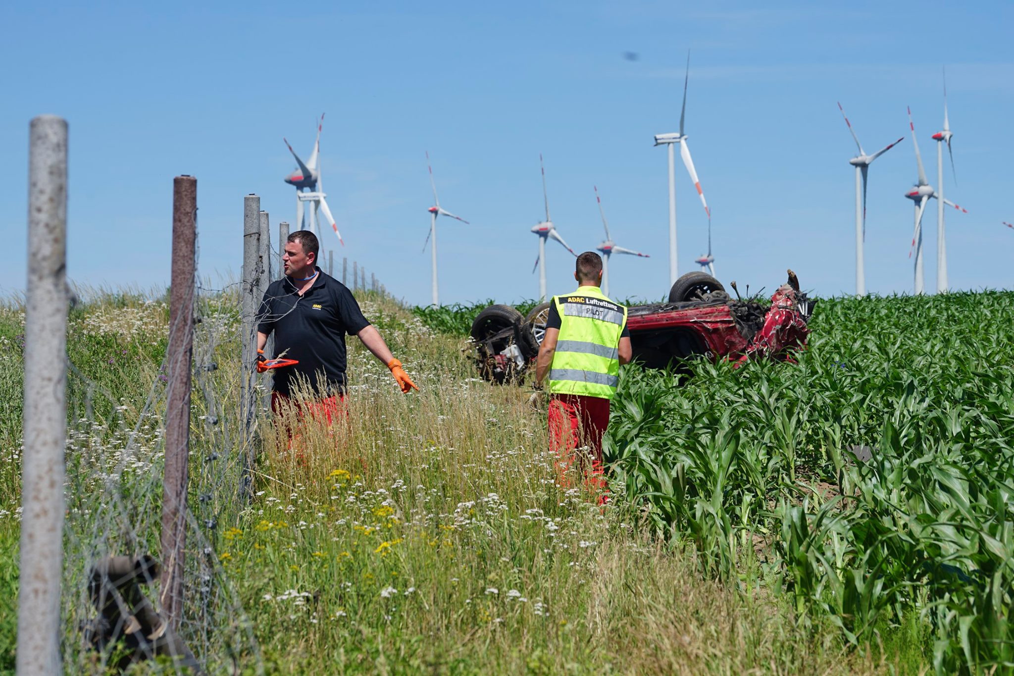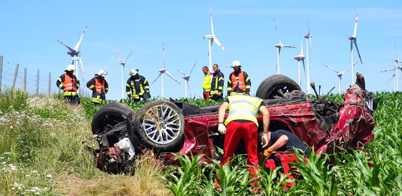 Das Auto überschlug sich auf einem Maisfeld mehrfach und kam ca. 15 Meter neben der Fahrbahn auf dem Dach zum Stillstand. Der Fahrer wurde aus dem Pkw geschleudert. Der Aufprall war derart heftig, dass der Motorblock aus dem Fahrzeug herausgeschleudert wurde. Der Notarzt konnte nur noch den Tod des Mannes feststellen.