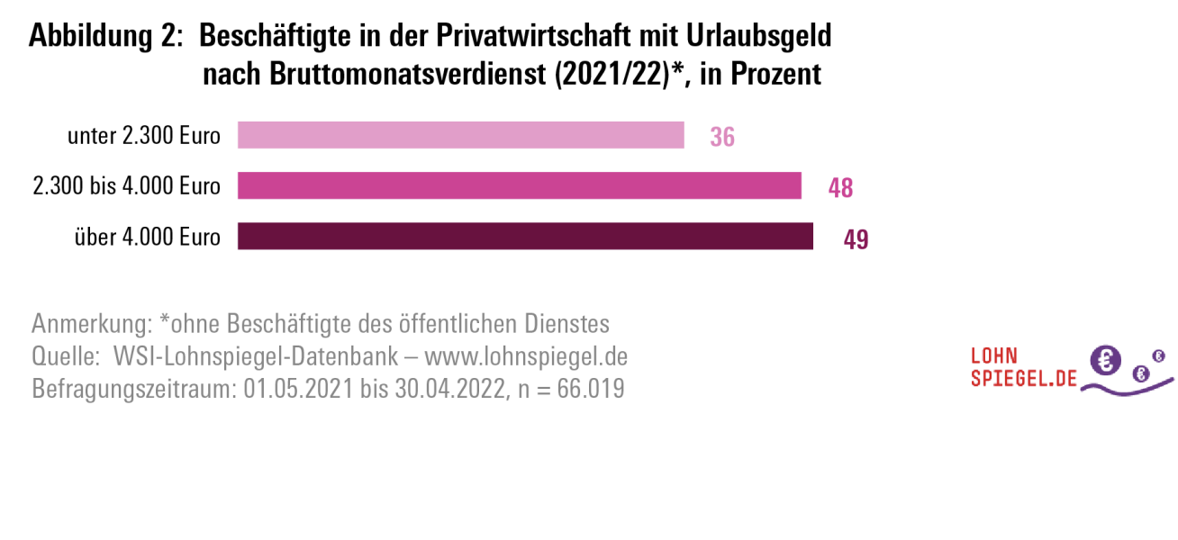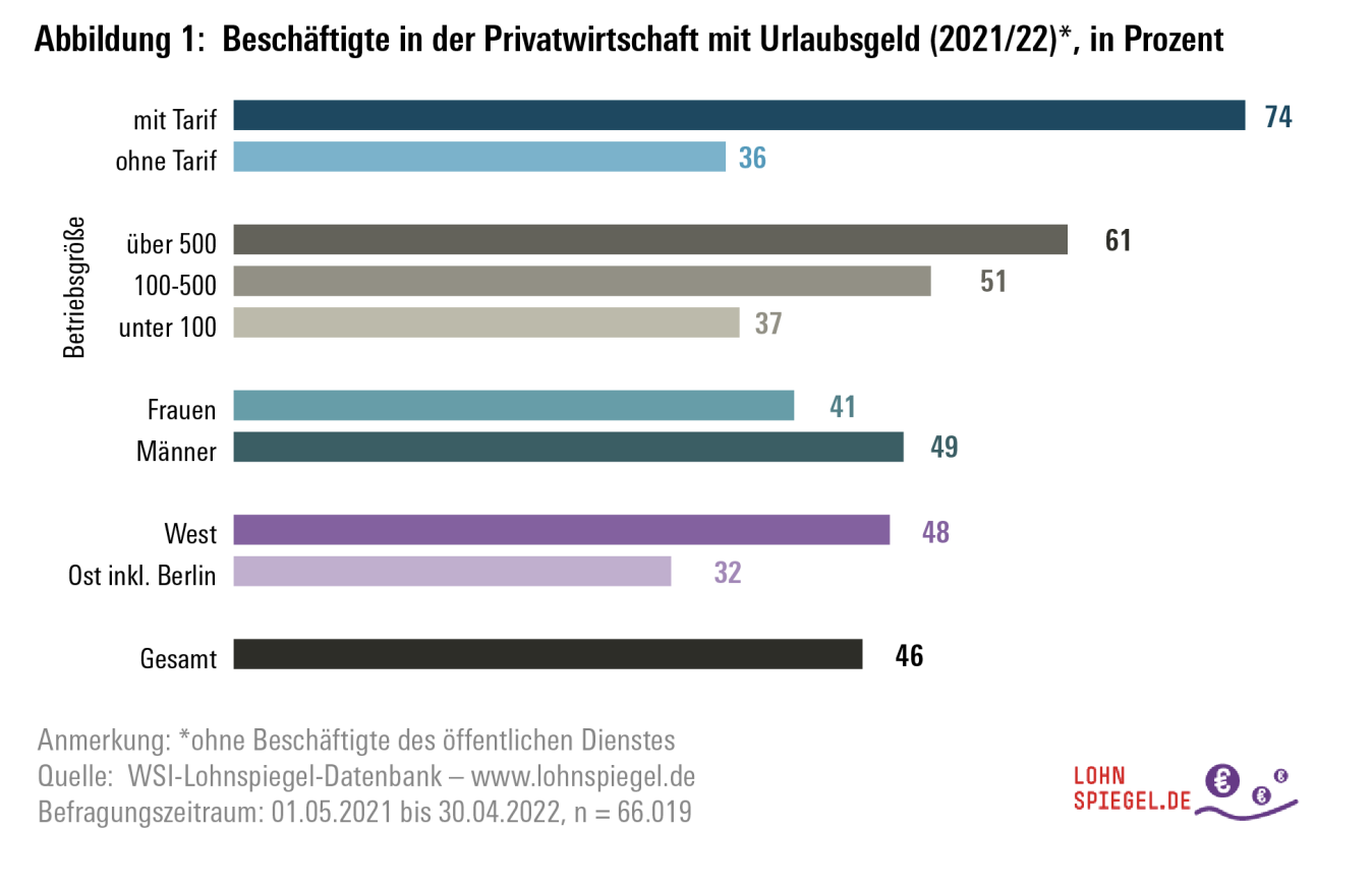In Deutschland erhalten etwas weniger als die Hälfte (46 Prozent) aller Beschäftigten in der Privatwirtschaft Urlaubsgeld. Zu diesem Ergebnis kommt eine aktuelle Online-Befragung des Internet-Portals Lohnspiegel.de, das vom Wirtschafts- und Sozialwissenschaftlichen Institut (WSI) der Hans-Böckler-Stiftung betreut wird. Für die Analyse wurden die Angaben von mehr als 66.000 Beschäftigten aus dem Zeitraum von Anfang Mai 2021 bis Ende April 2022 ausgewertet.