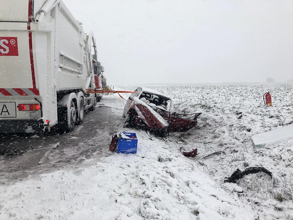 Durch den Zusammenprall wurde das Fahrzeug in den Straßengraben geschleudert und die Fahrerin im Fahrzeug eingeklemmt.
