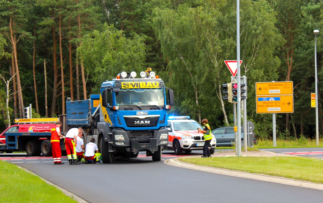 Noch eine offizielle Nachmeldung der Polizei zum schlimmen Unfall heute in Waren. Nach bisherigem Erkenntnisstand befuhr der 45-jährige Fahrer eines LKW die Röbeler Chaussee in Richtung Klink. Auf Höhe der Ampel Röbeler Chaussee/ Warendorfer Straße wollte er nach rechts in die Warendorfer Straße abbiegen und stieß mit einer 59-jährigen Radlerin, die auf dem Radweg in Richtung Klink unterwegs war, zusammen.