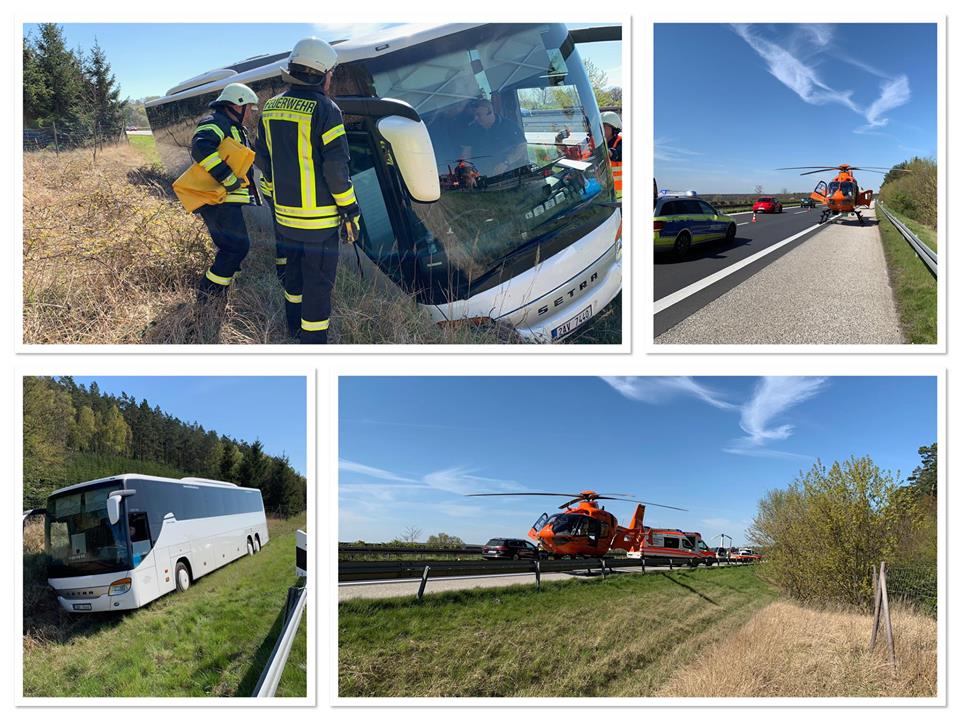 Alle Insassen des Busses, 12 Reisende, der Reiseleiter und der Busfahrer wurden am Unfallort von Rettungskräften und Ärzten untersucht. Ein Bus des kreiseigenen Nahverkehrs hat die Reisenden zu einem Betreuungszentrum des Deutschen Roten Kreuzes gebracht.