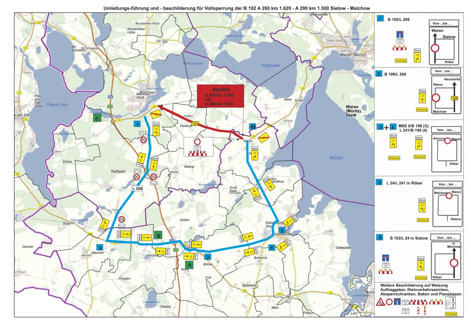 Die offizielle Umleitungsstrecke führt von der B 192 über die L 206 (Rogeez) zur B 198 bis Röbel und von Röbel über die L 24 nach Sietow und umgekehrt.