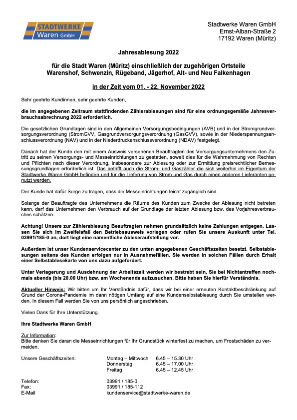 In der Zeit vom 1. bis 22. November sind die Ableser der Stadtwerke Waren GmbH in Waren sowie den Ortsteilen Warenshof, Schwenzin, Rügeband, Jägerhof sowie Alt- und Neu Falkenhagen unterwegs. Die Daten sind für die Jahresverbrauchsabrechnung nötig. Die Beauftragten der Stadtwerke können sich selbstverständlich ausweisen, bei Unsicherheiten sollten die Stadtwerke angerufen werden. Und ganz wichtig: Die Ableser nehmen keine Zahlungen entgegen.