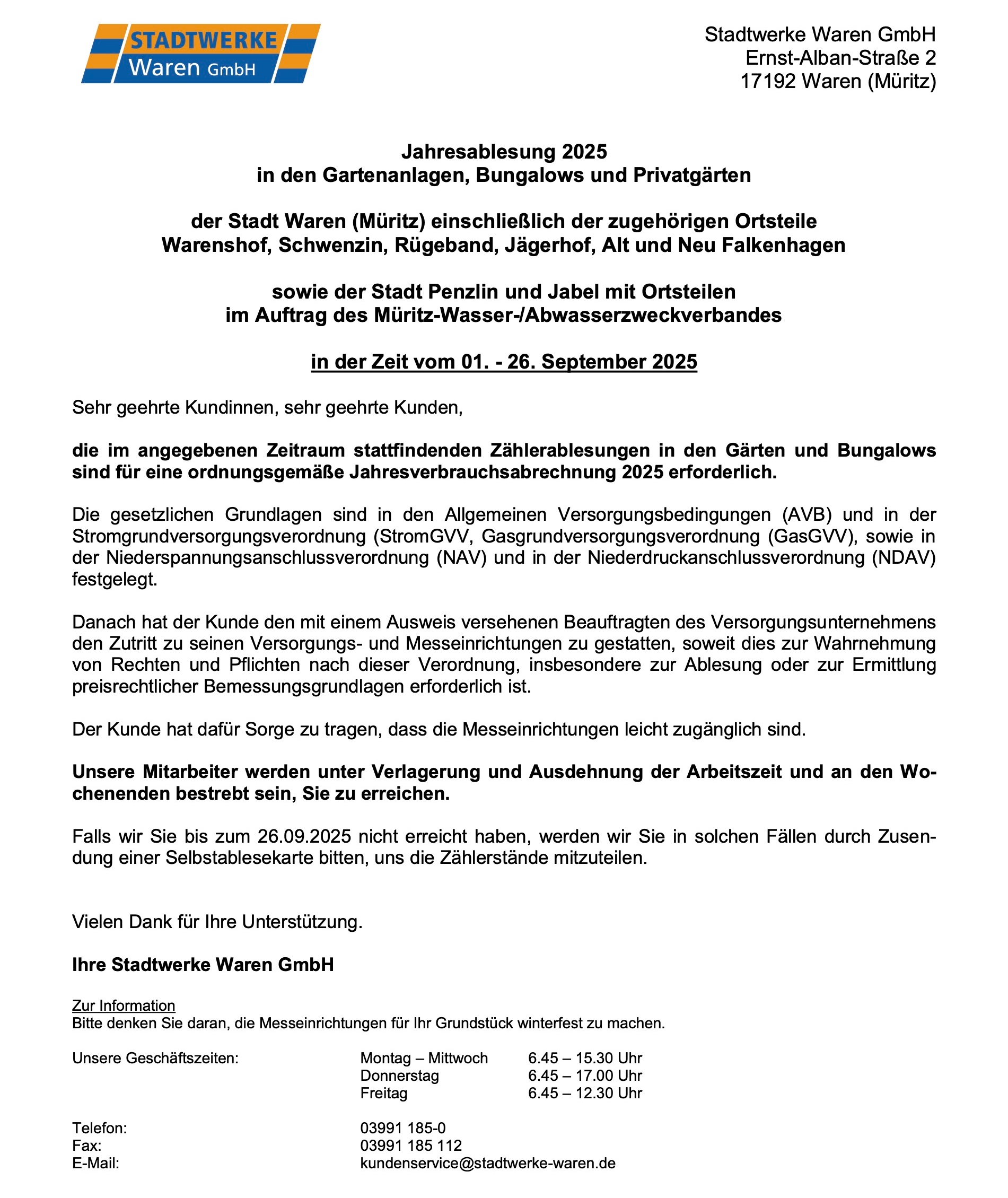 Die Jahresablesung in den Gärten steht wieder an. Und zwar in Waren und den Ortsteilen sowie in Penzlin und Jabel mit Ortsteilen: