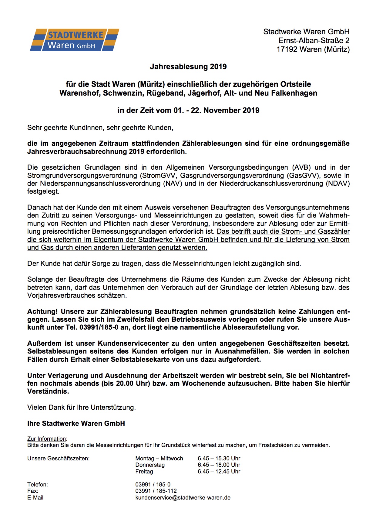 Es ist wieder so weit: Die Ableser der Warener Stadtwerke sind in Waren und den Ortsteilen unterwegs. Wichtig: Die Ableser nehmen grundsätzlich keine Zahlungen entgegen. Im Zweifelsfall sollten sich Kunden den Betriebsausweis vorlegen lassen oder unter Tel. 03991/185-0 anrufen, dort liegt eine namentliche Ableseraufstellung vor.