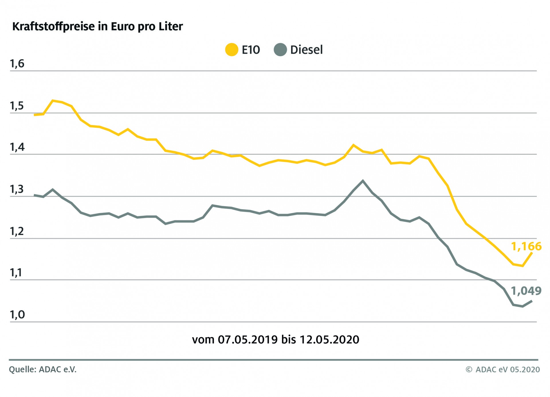 Nachdem die Rohölnotierungen zu Beginn des Jahres von rund 70 Dollar zeitweise auf 20 Dollar gesunken waren, kletterten sie in Erwartung einer langsam anziehenden Nachfrage auf rund 30 Dollar für ein Barrel der Sorte Brent. Dieses Niveau blieb am Rohölmarkt gegenüber der Vorwoche unverändert. Der aktuelle Anstieg der Kraftstoffpreise an den Tankstellen trägt der zuvor eingetretenen Erholung der Rohölnotierungen Rechnung.