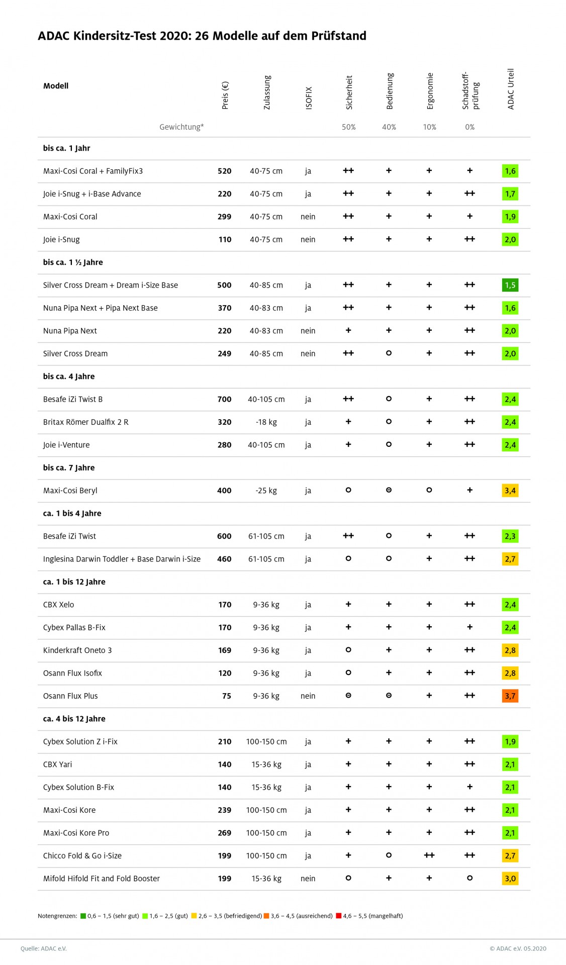 Der Großteil im ADAC Kindesitztest 2020 getesteten Sitze überschreitet die gesetzlichen Anforderungen teils deutlich. Dabei prüfte der ADAC 26 Sitze für alle Altersklassen auf Sicherheit, Handhabung und Schadstoffe. Das Ergebnis: Die Babyschale „Silver Cross Dream + Dream i-Size Base“ erhält als einziger Sitz das ADAC Urteil „sehr gut“, 18 Modelle erreichen „gut“ und sechs weitere ein „befriedigend“. Das Schlusslicht („ausreichend“) bildet der mit 75 Euro billigste Sitz, der „Osann Flux Plus“. Er ist zwar frei von Schadstoffen, zeigt aber Schwächen bei der Bedienung und in der Sicherheit. Erfreulich: keines der getesteten Modelle musste mit „mangelhaft“ bewertet werden, und kein Sitz scheiterte am gesetzlich nicht für alle Produkte vorgeschriebenen Seitenaufpralltest.