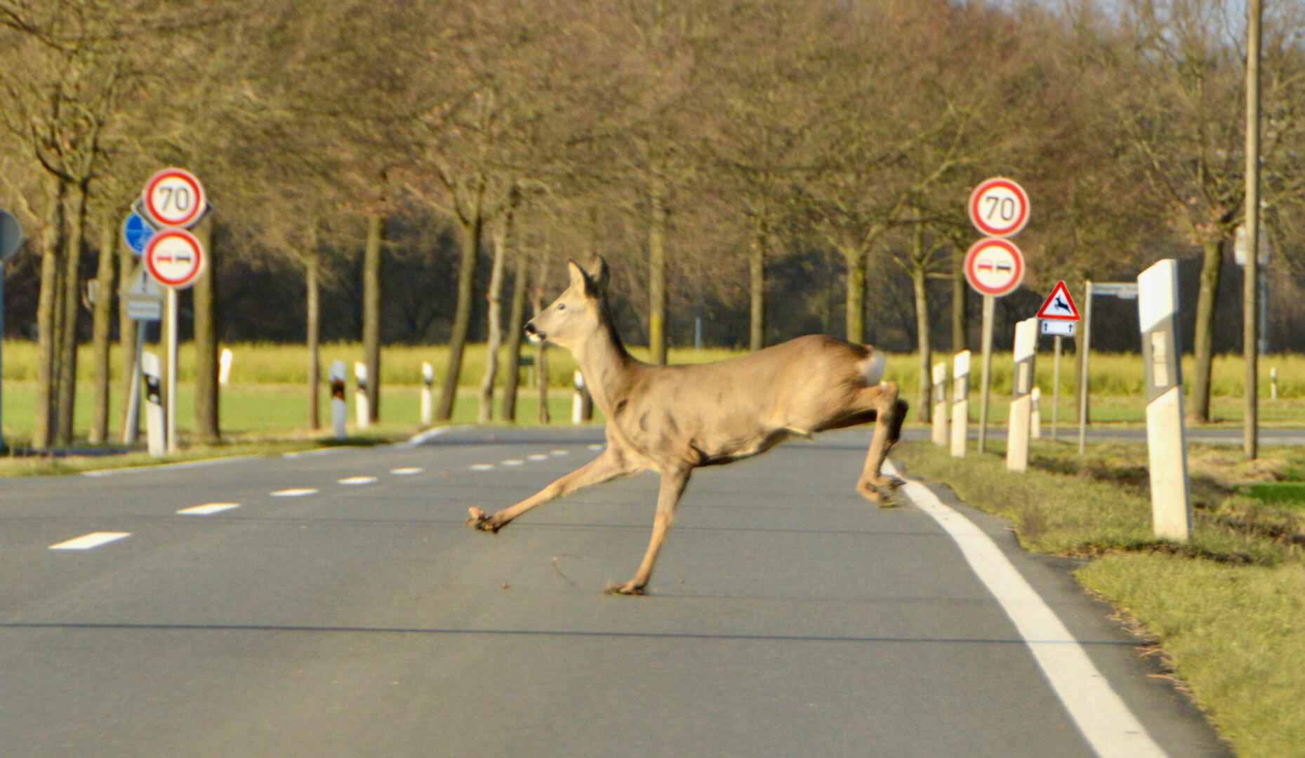 Zudem sollte man sich durch das Verhalten etwa von Rehen nicht in falscher Sicherheit wiegen. Auch wenn das Tier das eigene Auto vermeintlich bemerkt hat, ist das keine Garantie, dass es nicht doch vors Auto springt.