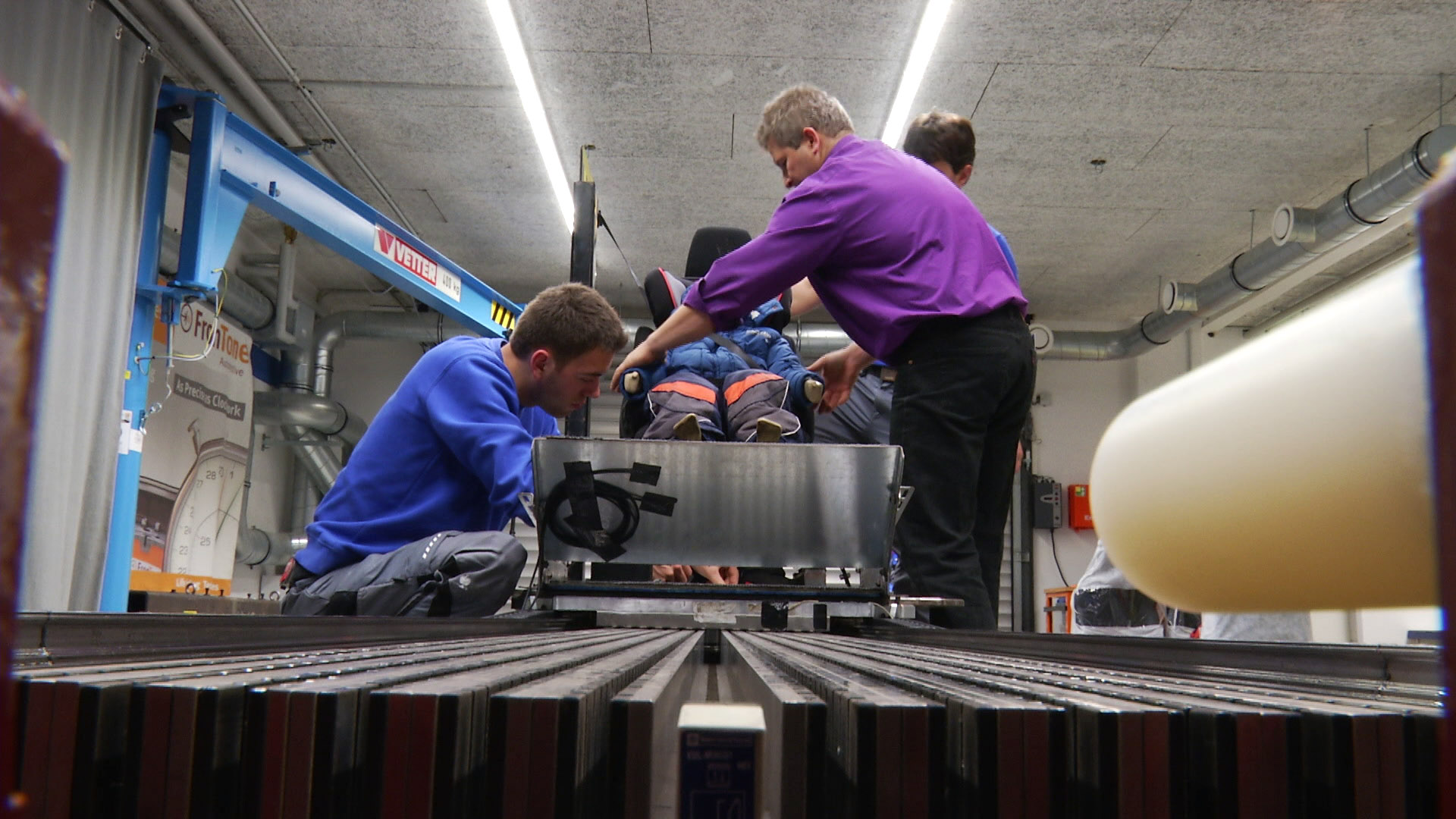 Winterkleidung im Auto ist keine gute Idee, insbesondere nicht für Kinder – das hat der ADAC eindrücklich in einem Crashtest mit einem Kleinkinder- und einem Erwachsenen-Dummy in dicken Anoraks bewiesen. Grund: Der Gurt liegt nur lose am Körper an und kann bei einem Unfall nicht optimal schützen. Zudem sollte der Fahrzeuglenker Mützen, Handschuhe und schwere Stiefel vermeiden. Die ADAC Ingenieure simulierten eine alltägliche Verkehrssituation, in der ein Erwachsener- und ein Kinder-Dummy in dicker Winterkleidung auf einem Sitz beziehungsweise im Kindersitz angegurtet waren. Anschließend wurde der Gurt-Schlitten jeweils mit einer Geschwindigkeit von 16 km/h abrupt gestoppt – analog zu einem Auffahrunfall im Stadtverkehr.