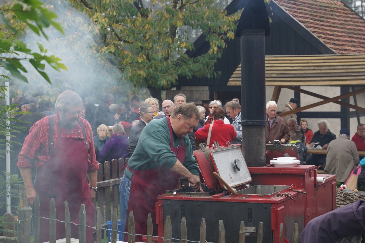 An den Imbissständen werden Wellfleisch, rote und weiße Grützwurst, Eisbein, Bouletten sowie Bratwurst angeboten. Und in der Kaffeestube gibt’s frisch gebackenen Kuchen, Steinofenbrot und Schmalzstullen.