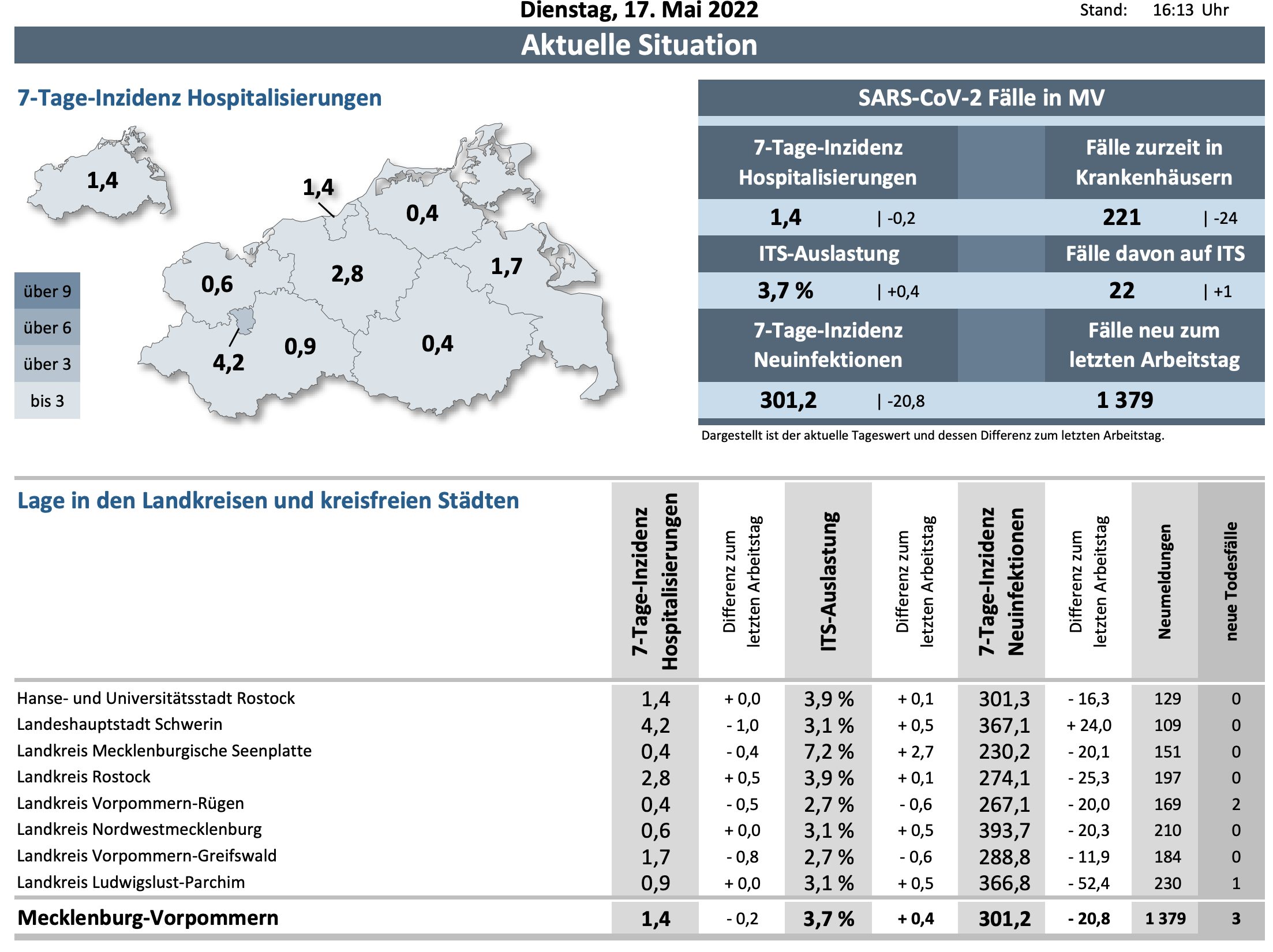 Die Hospitalisierung in ganz Mecklenburg-Vorpommern liegt heute bei 1,4, die Inzidenz des Landes bei 301,2. Das Land Mecklenburg-Vorpommern meldet heute 1379 Neuinfektionen und drei neue Todesfälle.