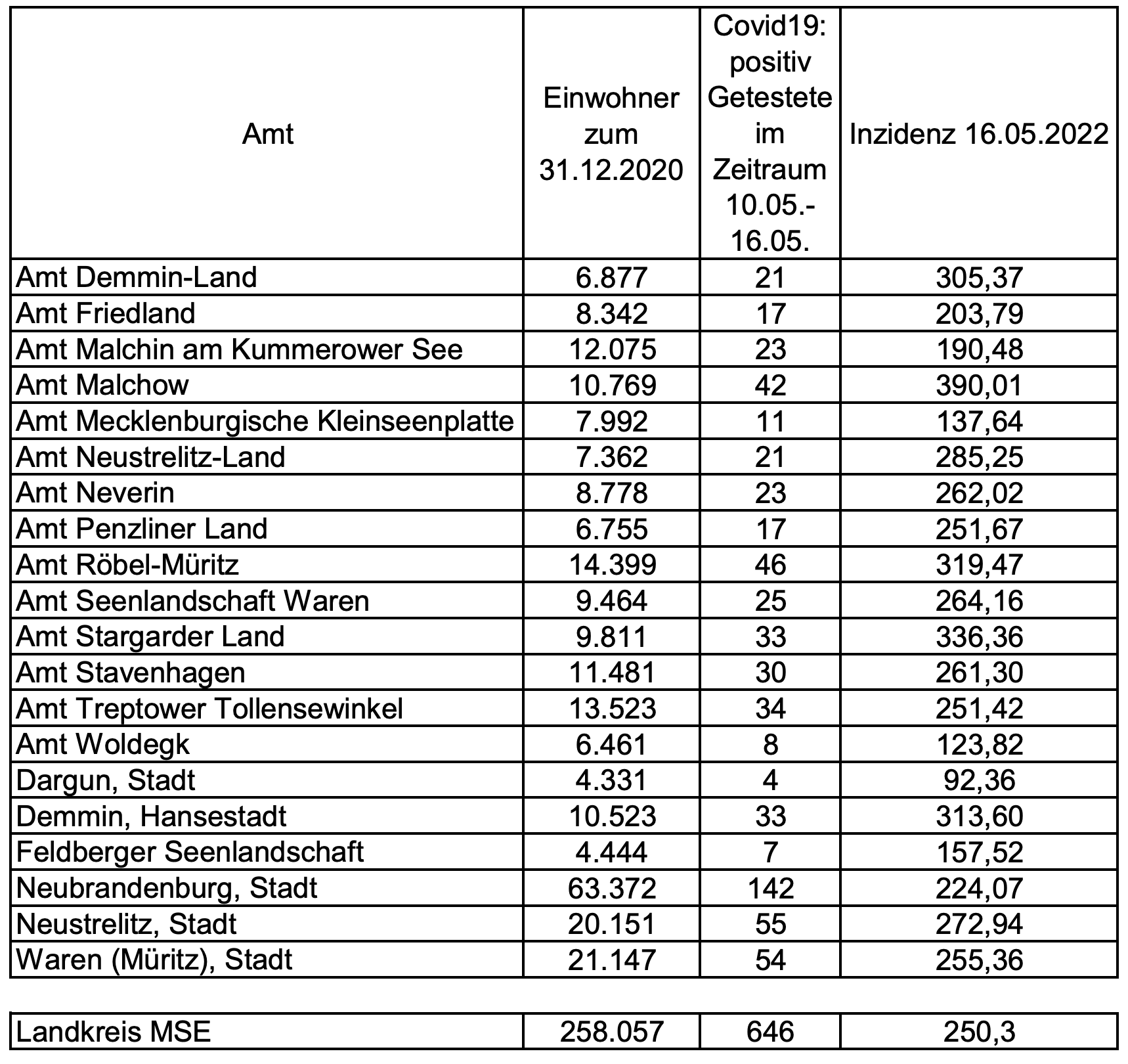 Die Inzidenz des Landkreises Mecklenburgische Seenplatte liegt heute bei 230,2. Für den Landkreis werden heute 151 Neuinfektionen gemeldet. Im heutigen Artikel veröffentlichen wir wieder die Inzidenzen des Landkreises für die einzelnen Städte und Ämter. Demnach liegt die Inzidenz im Amt Malchow bei 390,01, im Amt Penzliner Land bei 251,67, im Amt Röbel-Müritz bei 319,47, im Amt Seenlandschaft Waren bei 264,16 und in der Stadt Waren bei 255,36.