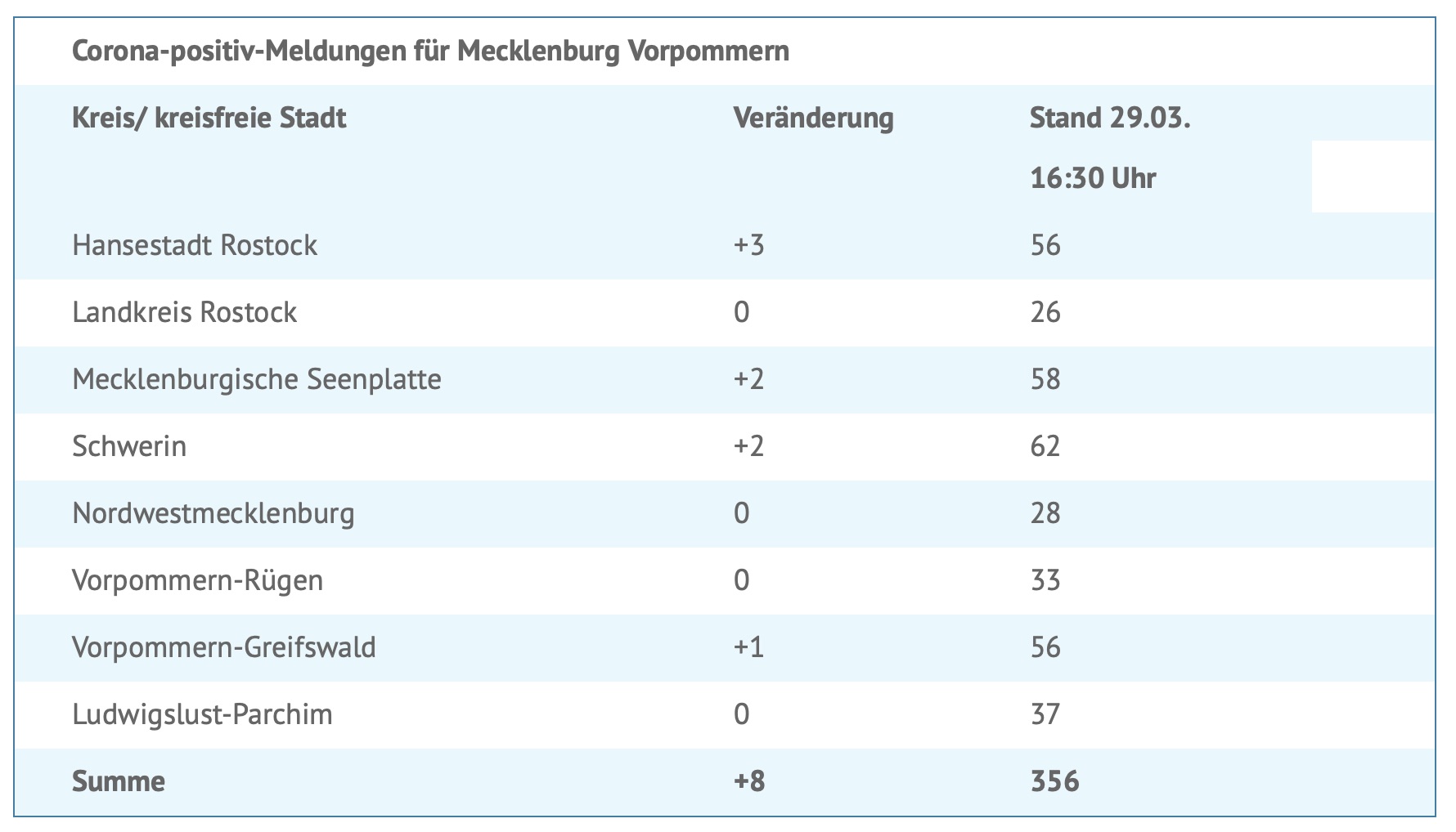 Seit gestern wurden 8 neue Corona-Infektionen aus den Landkreisen und kreisfreien Städten gemeldet, davon zwei aus dem Landkreis Mecklenburgische Seenplatte.