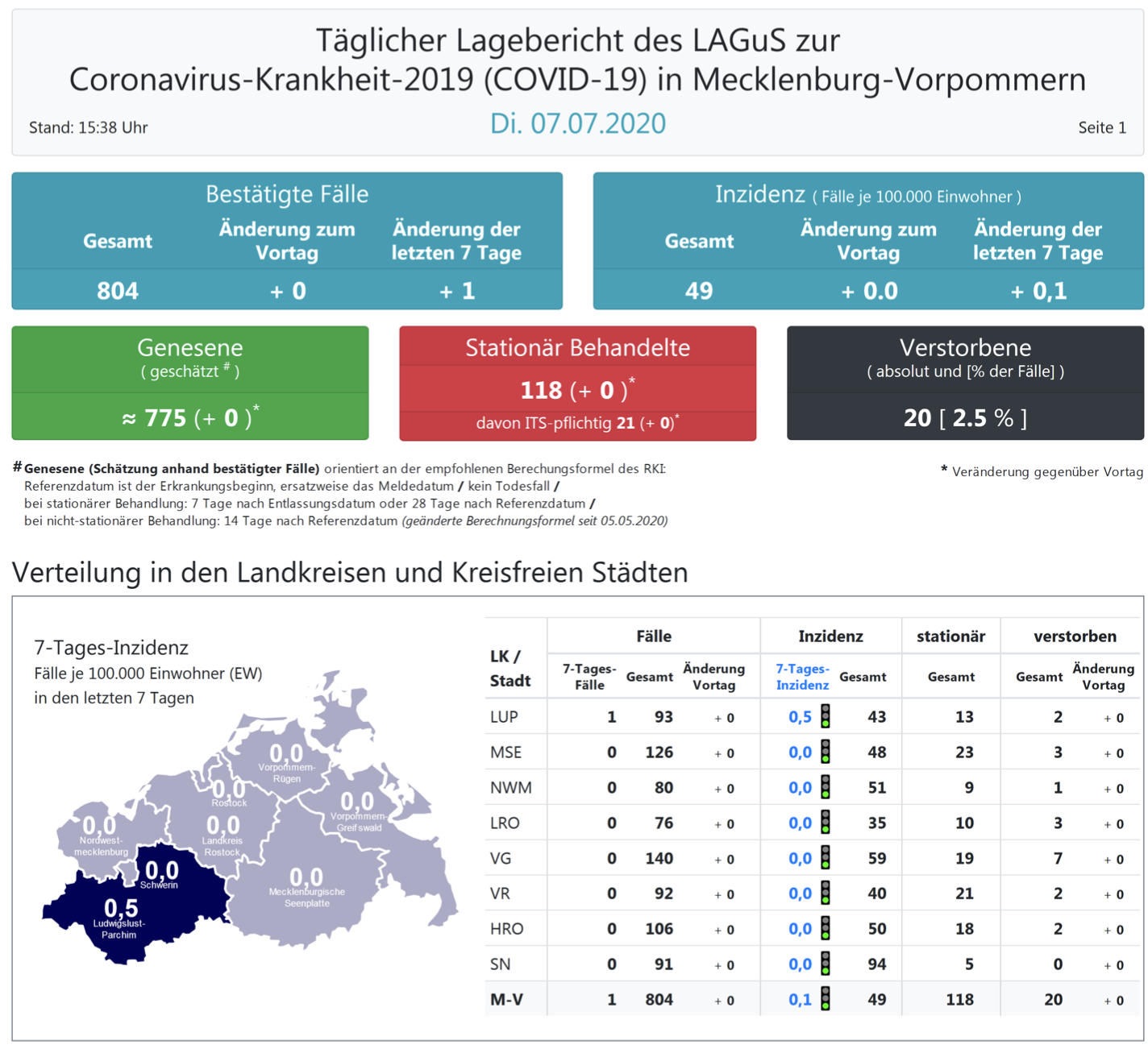 Landesweit müssen oder mussten 118 Menschen den Angaben zufolge in Kliniken behandelt werden – 21 von ihnen auf Intensivstationen. Laut einer Schätzung des Robert Koch-Instituts (RKI) sind in Mecklenburg-Vorpommern 775 Personen der positiv getesteten Menschen von einer Covid-19-Erkrankung genesen. Insgesamt gab es bislang 20 Todesfälle im Land.