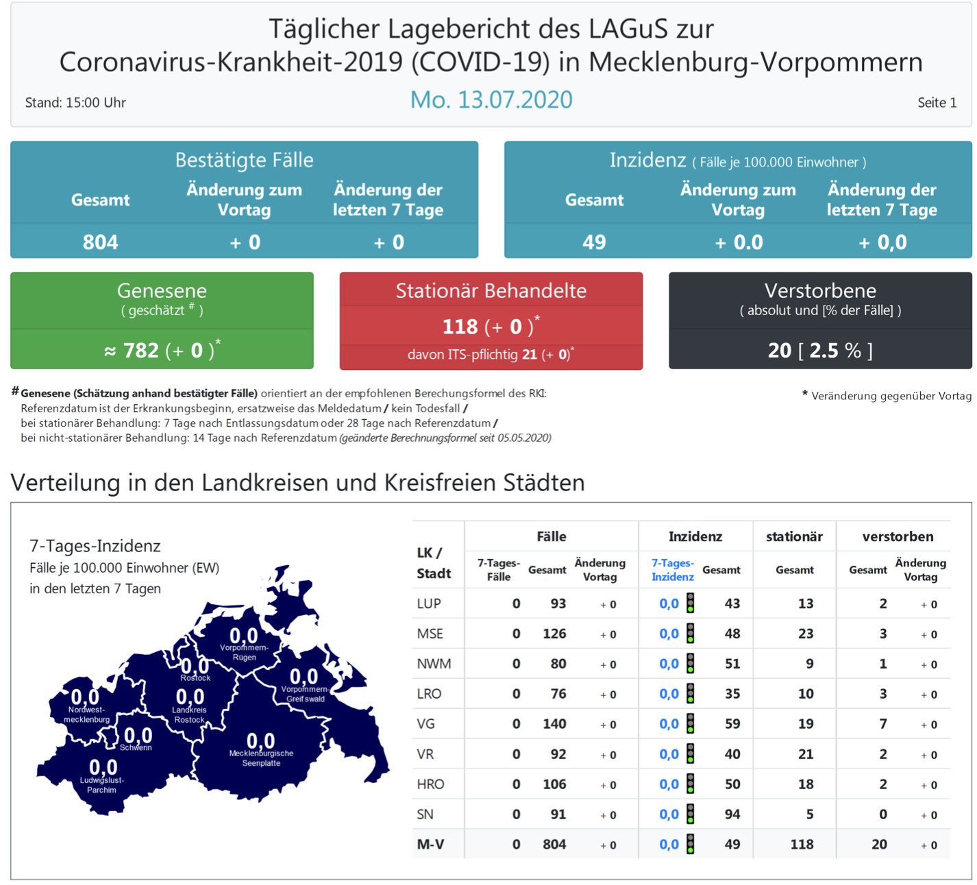 Landesweit müssen oder mussten den Angaben zufolge 118 Menschen in Kliniken behandelt werden – 21 von ihnen auf Intensivstationen. Laut einer Schätzung des Robert Koch-Instituts (RKI) sind in Mecklenburg-Vorpommern 782 Personen der positiv getesteten Menschen von einer Covid-19-Erkrankung genesen. Insgesamt gab es bislang 20 Todesfälle im Land.