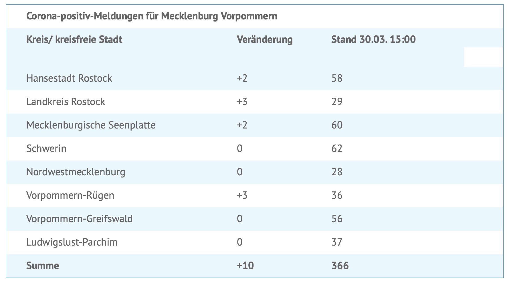 Seit gestern wurden zehn neue Corona-Infektionen aus den Landkreisen und kreisfreien Städten gemeldet, davon zwei im Landkreis Mecklenburgische Seenplatte. Insgesamt wurden bislang 366 Menschen in MV positiv auf das Virus getestet.