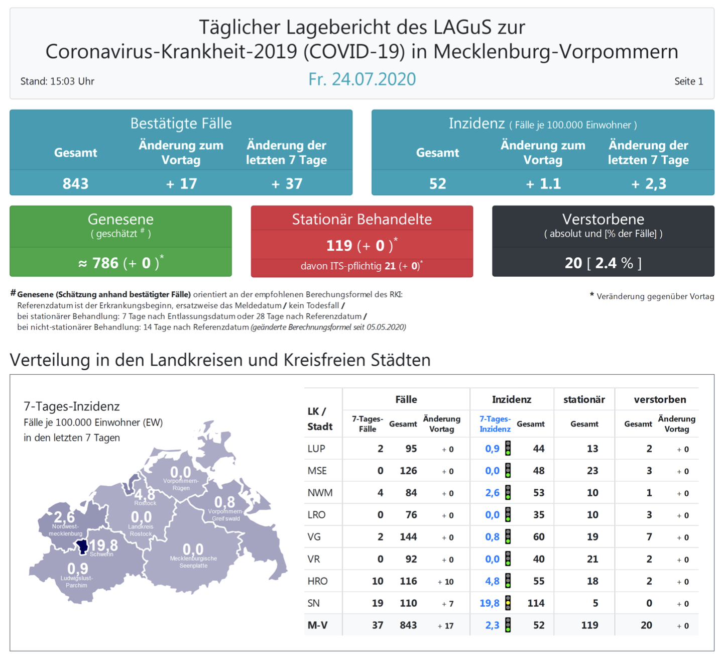 Laut einer Schätzung des Robert Koch-Instituts (RKI) sind in Mecklenburg-Vorpommern 786 Personen der positiv getesteten Menschen von einer Covid-19-Erkrankung genesen.