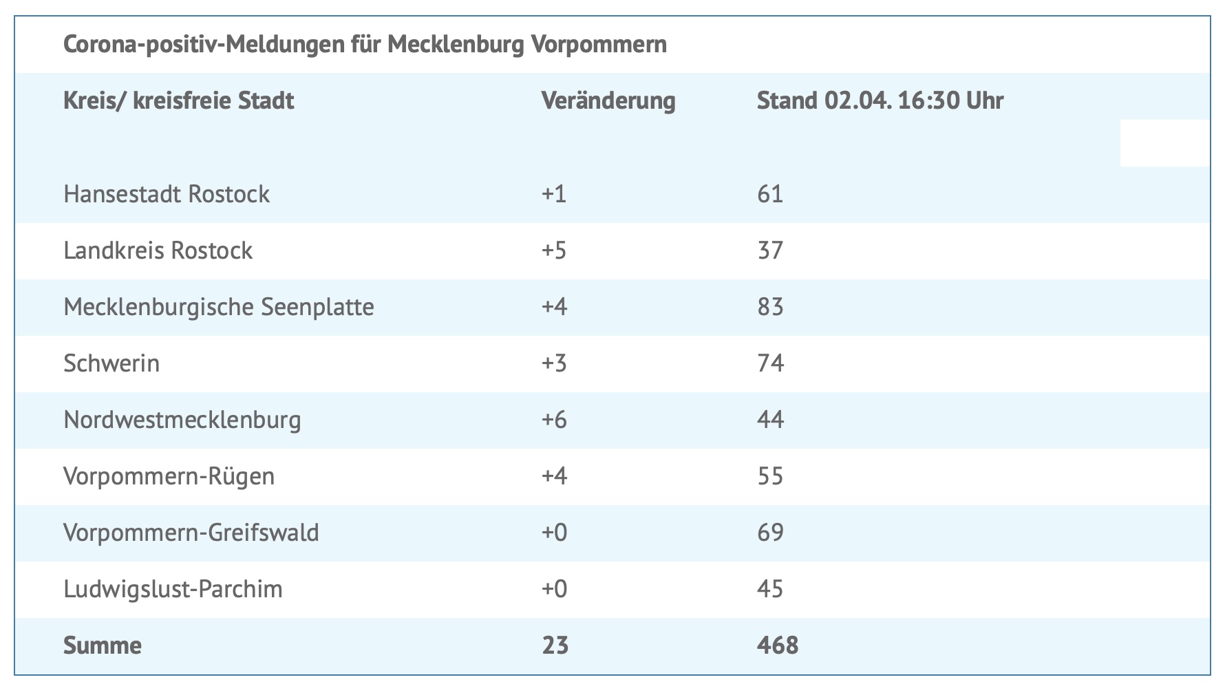 Insgesamt wurden bislang 468 Menschen in MV positiv auf das Virus getestet. 62 Personen mussten/müssen im Krankenhaus behandelt werden, neun davon auf einer Intensivstation. Bislang gab es vier Sterbefälle in Mecklenburg-Vorpommern.