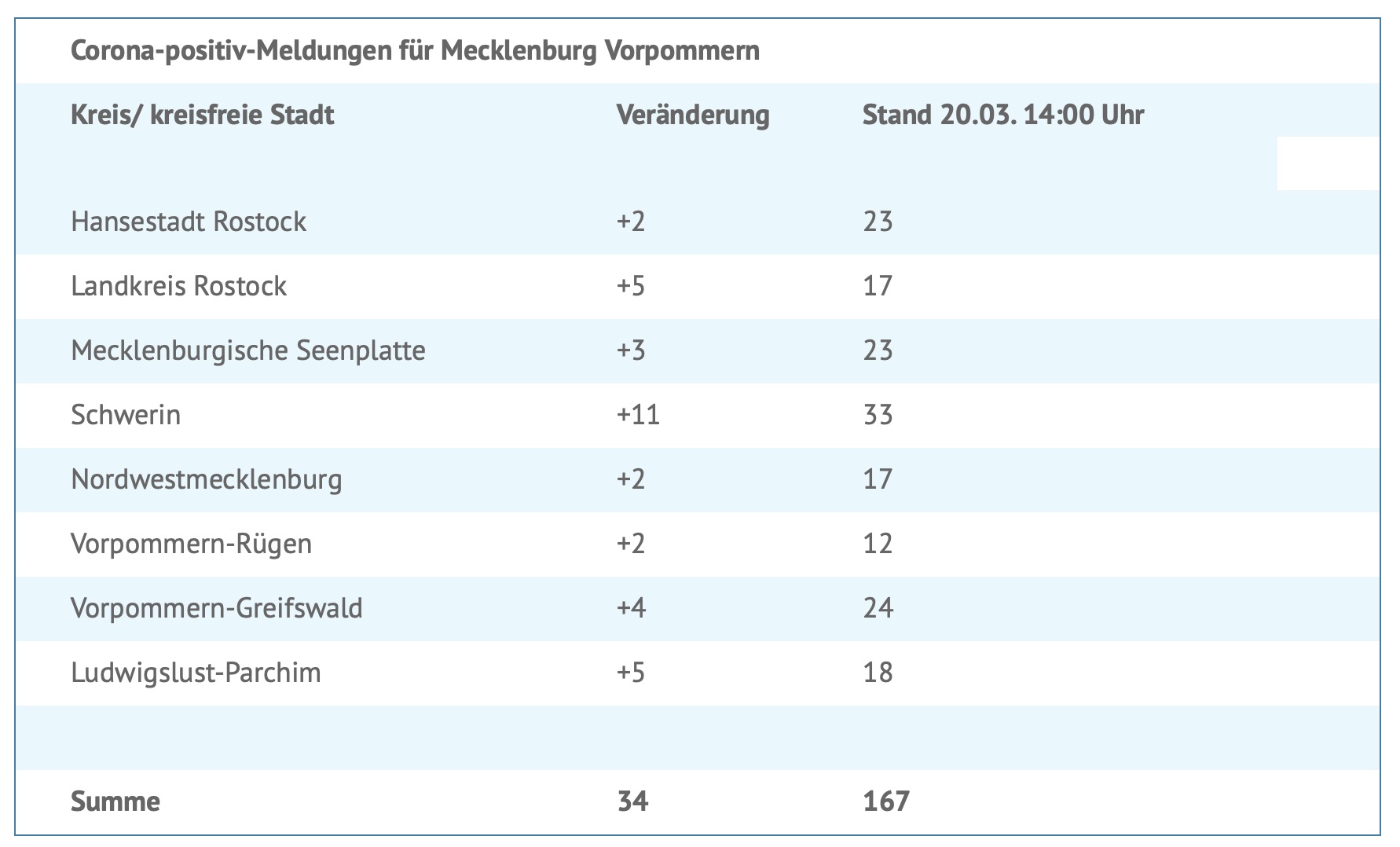 Seit gestern wurden 34 neue Corona-Infektionen aus den Landkreisen und kreisfreien Städten gemeldet. Insgesamt wurden bislang 167 Menschen in MV positiv auf das Virus getestet.