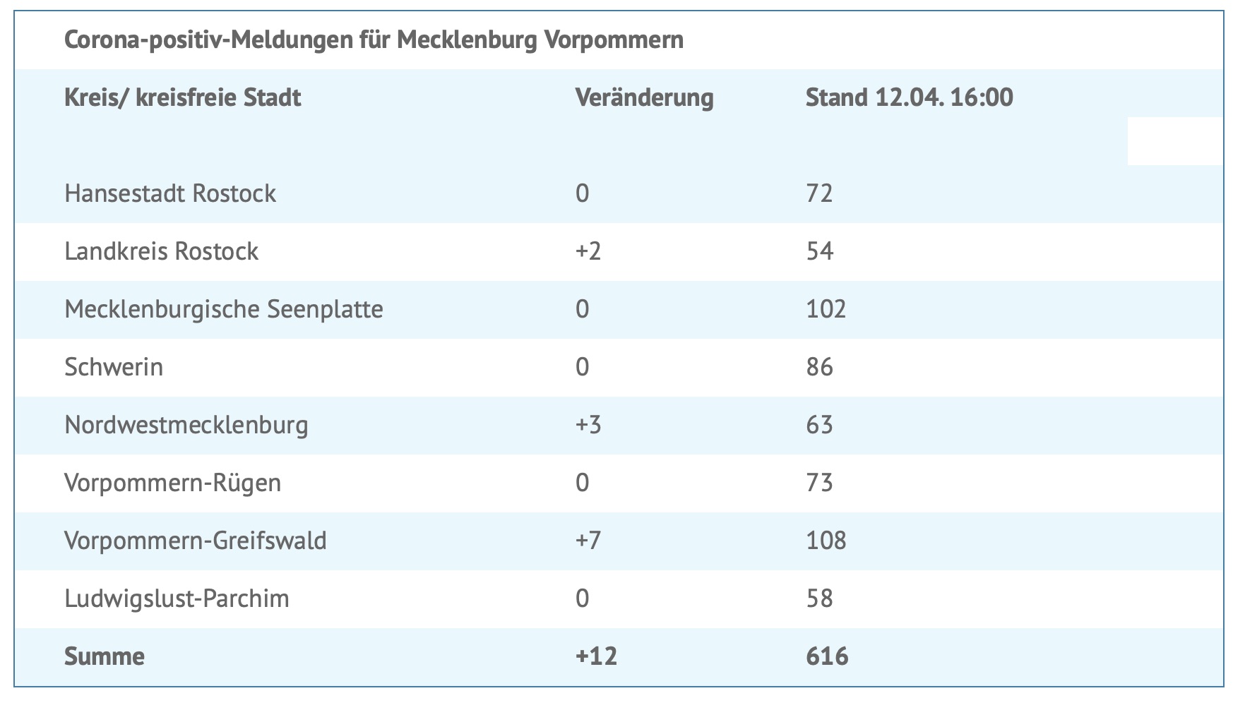 Insgesamt wurden bislang 616 Menschen in MV positiv auf das Virus getestet. 88 Personen mussten/müssen im Krankenhaus behandelt werden, 15 davon auf einer Intensivstation. Insgesamt gab es bislang elf Sterbefälle in Mecklenburg-Vorpommern.